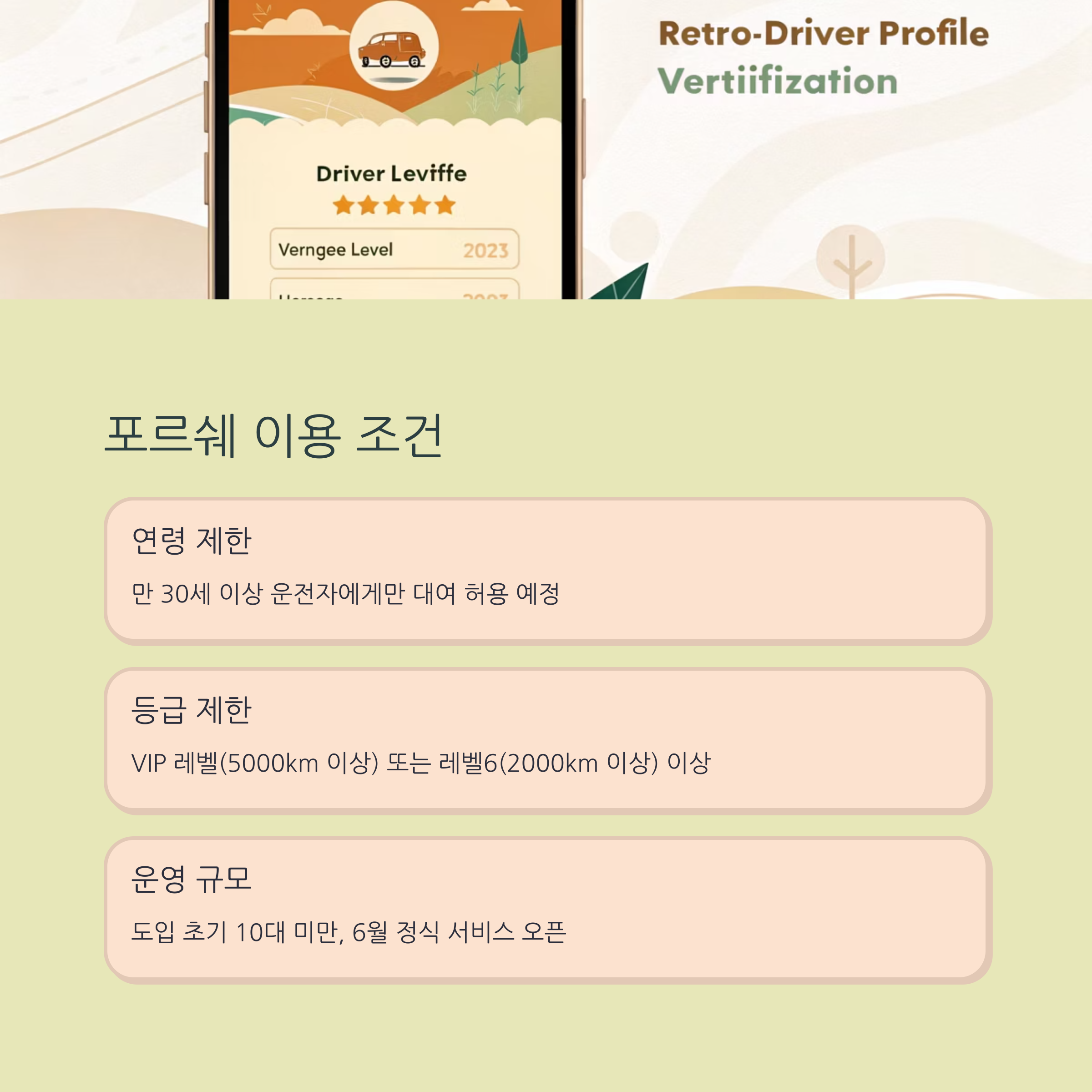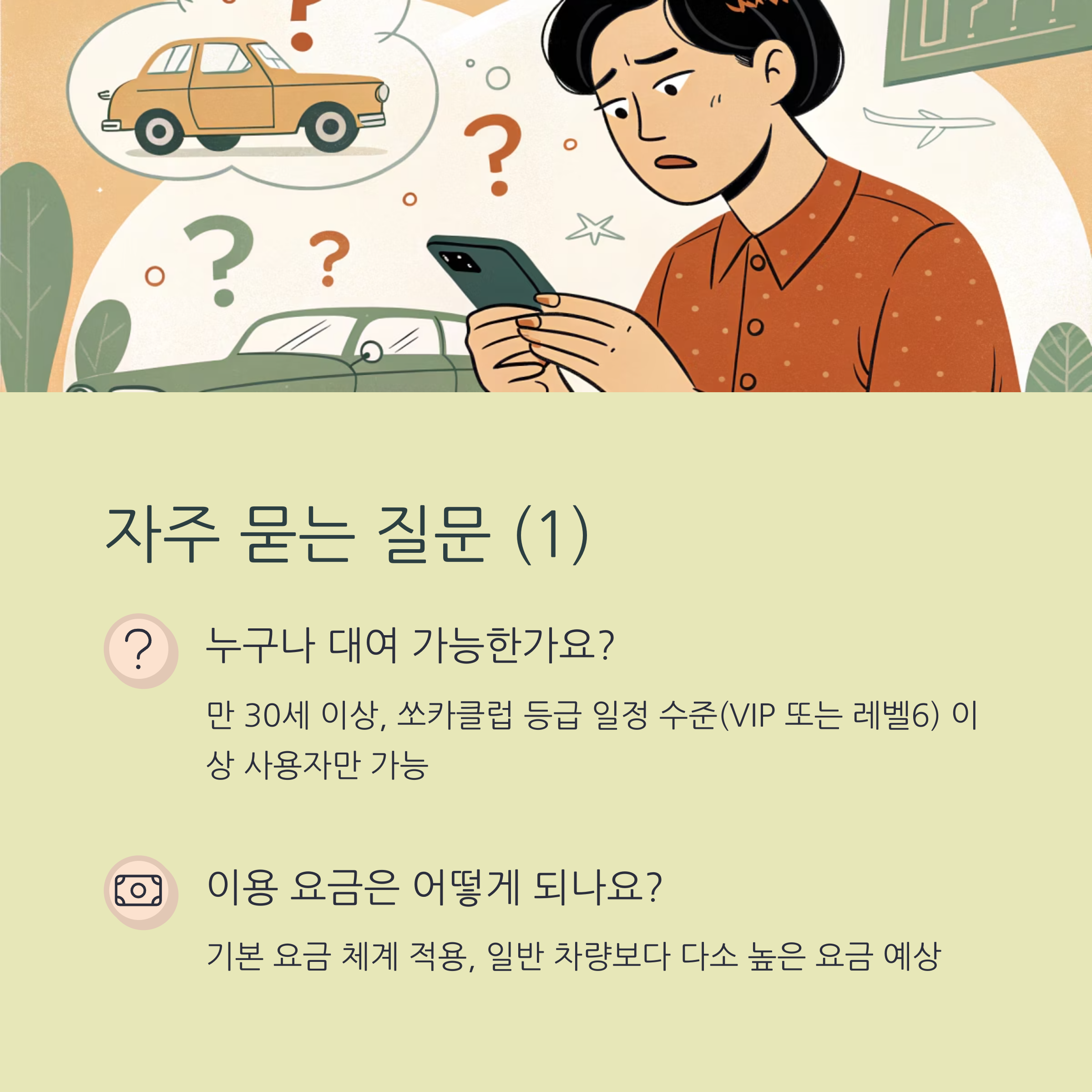 현재 예상되는 조건에 따르면, 만 30세 이상이고 쏘카클럽 등급이 일정 수준 이상인 사용자(VIP 또는 레벨6 이상)만 대여 가능할 것으로 보입니다. 정확한 조건은 6월 정식 서비스 오픈 시 공개될 예정입니다.