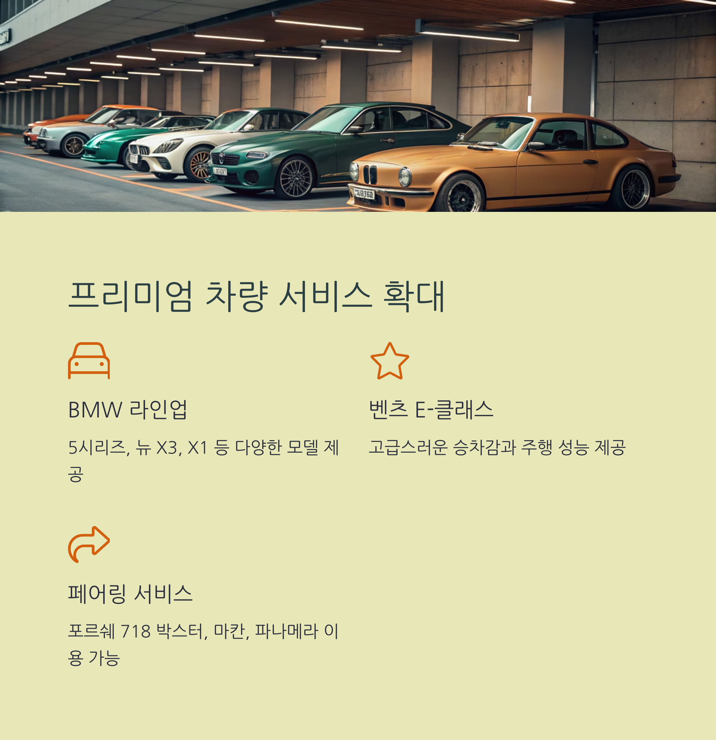 쏘카는 포르쉐 외에도 다양한 프리미엄 차량 라인업을 확대하고 있습니다. 현재도 BMW 5시리즈, 벤츠 E-클래스 등의 모델이 이용 가능하며, 이들 차량은 일반 세단과 차별화된 주행 성능과 고급스러운 승차감을 제공합니다.