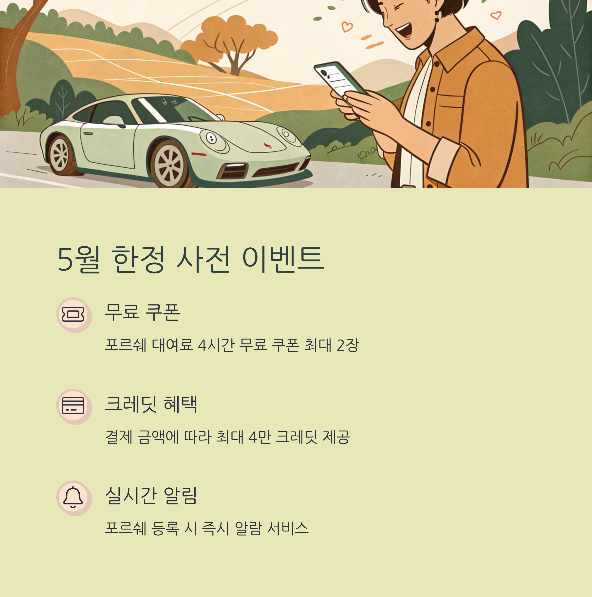 쏘카는 포르쉐 도입을 기념하여 5월 한 달간 풍성한 사전 이벤트를 진행 중입니다. 이 이벤트는 포르쉐 정식 서비스 이전에 브랜드 경험을 유도하고 이용자의 관심과 참여를 극대화하기 위한 전략입니다. 다음은 사전 이벤트의 주요 내용입니다.