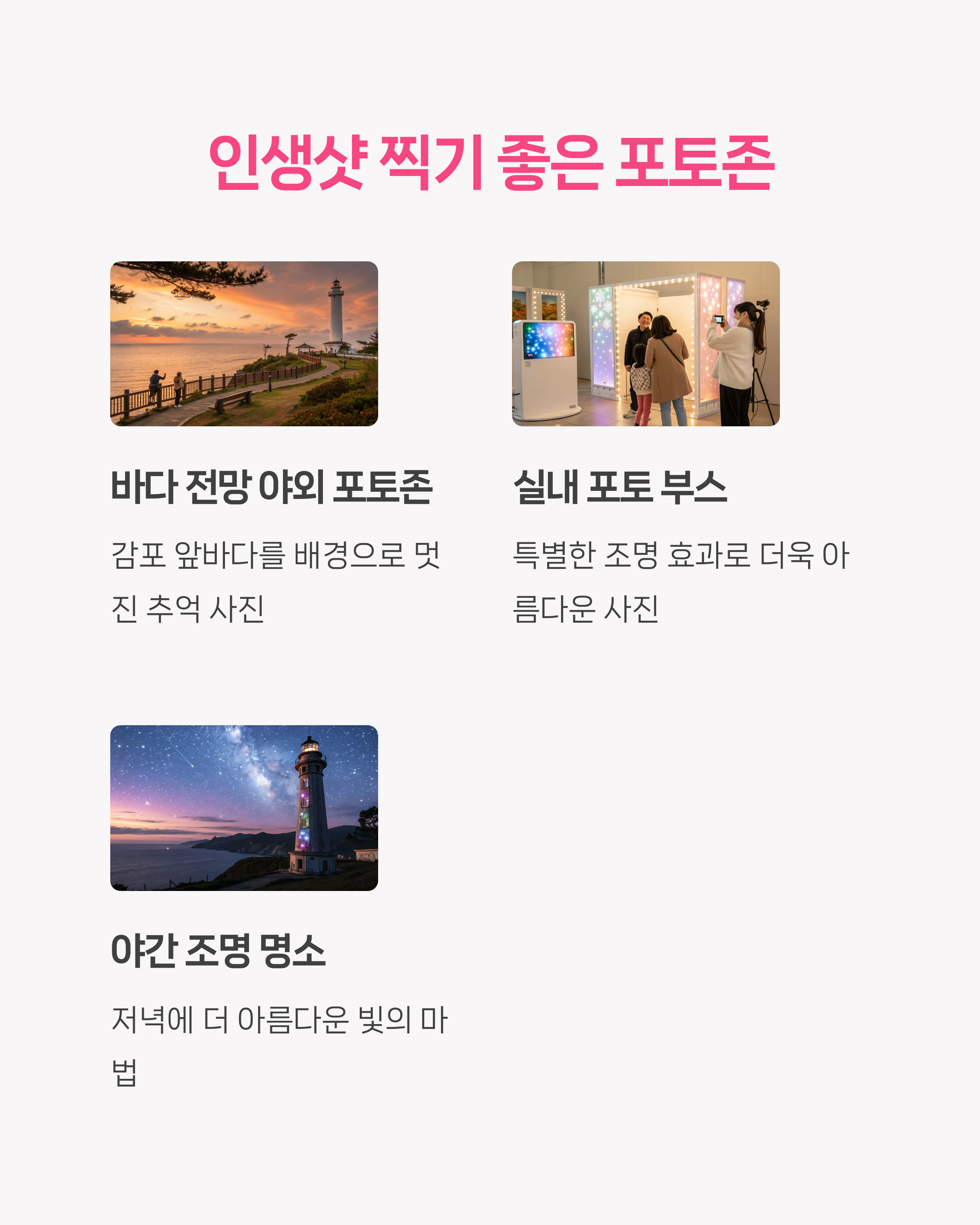 | 미디어 아트, 포토부스, 빛 터널 체험 | 퀴즈, 환경 게임, 유아 볼 풀장 | 바다 전경, 정원, 야경 조명 |