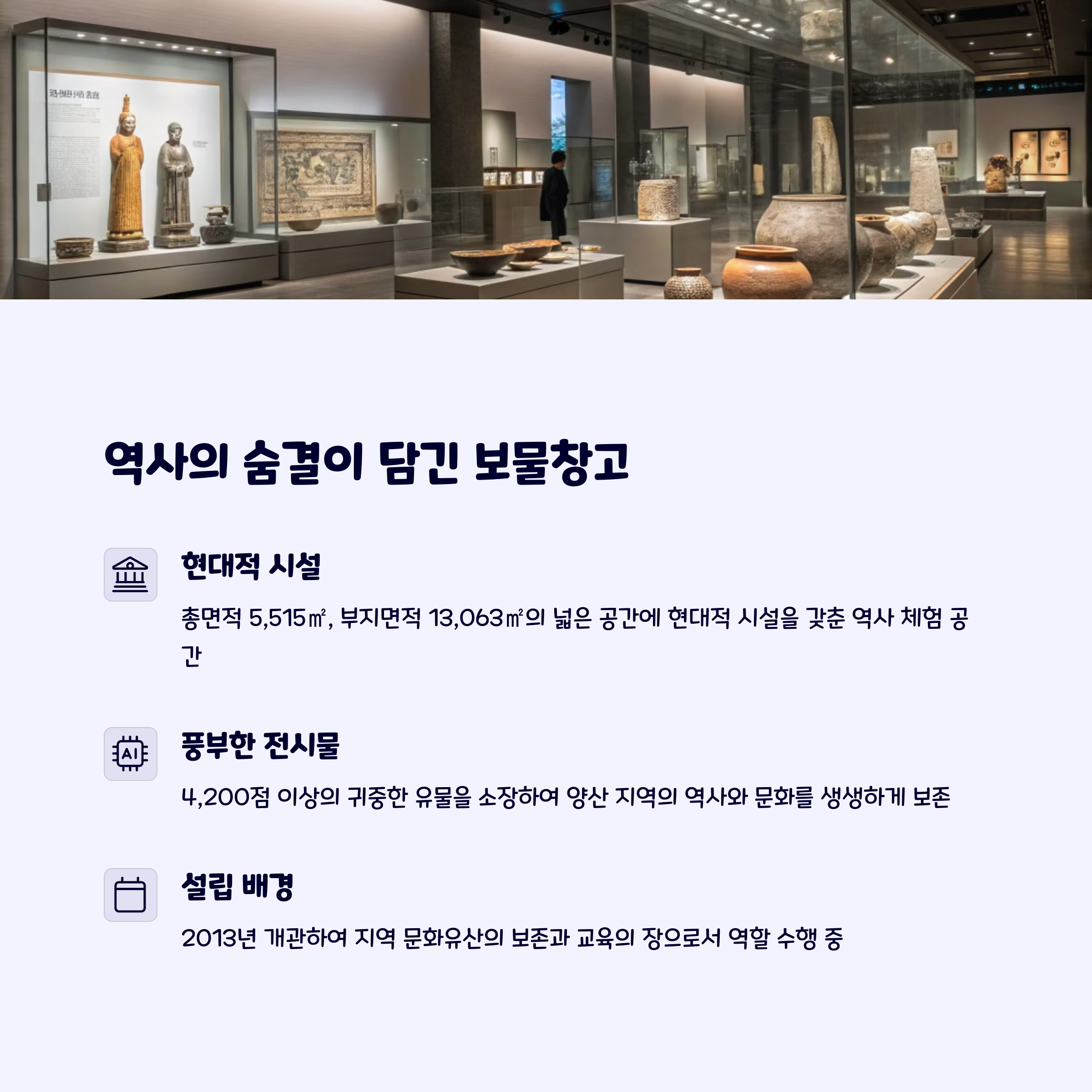 위치는 경상남도 양산시 북정로 78이며, 지하 1층부터 지상 4층까지 총면적 5,515㎡ 규모의 건물에 4,200점 이상의 유물을 소장하고 있습니다.