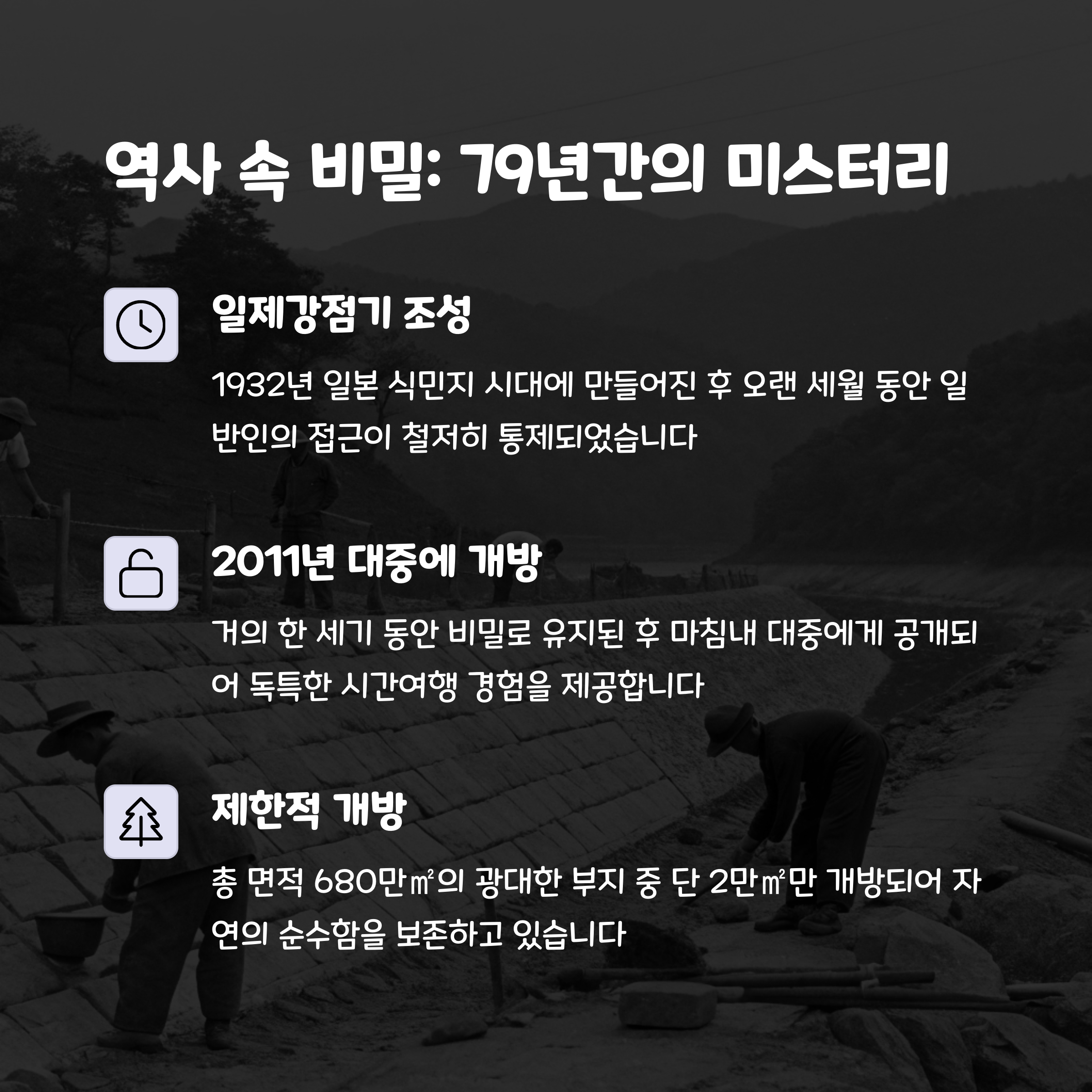 일제강점기인 1932년에 조성되어 무려 79년간 일반인의 출입이 통제된 ‘금단의 땅’이었죠.