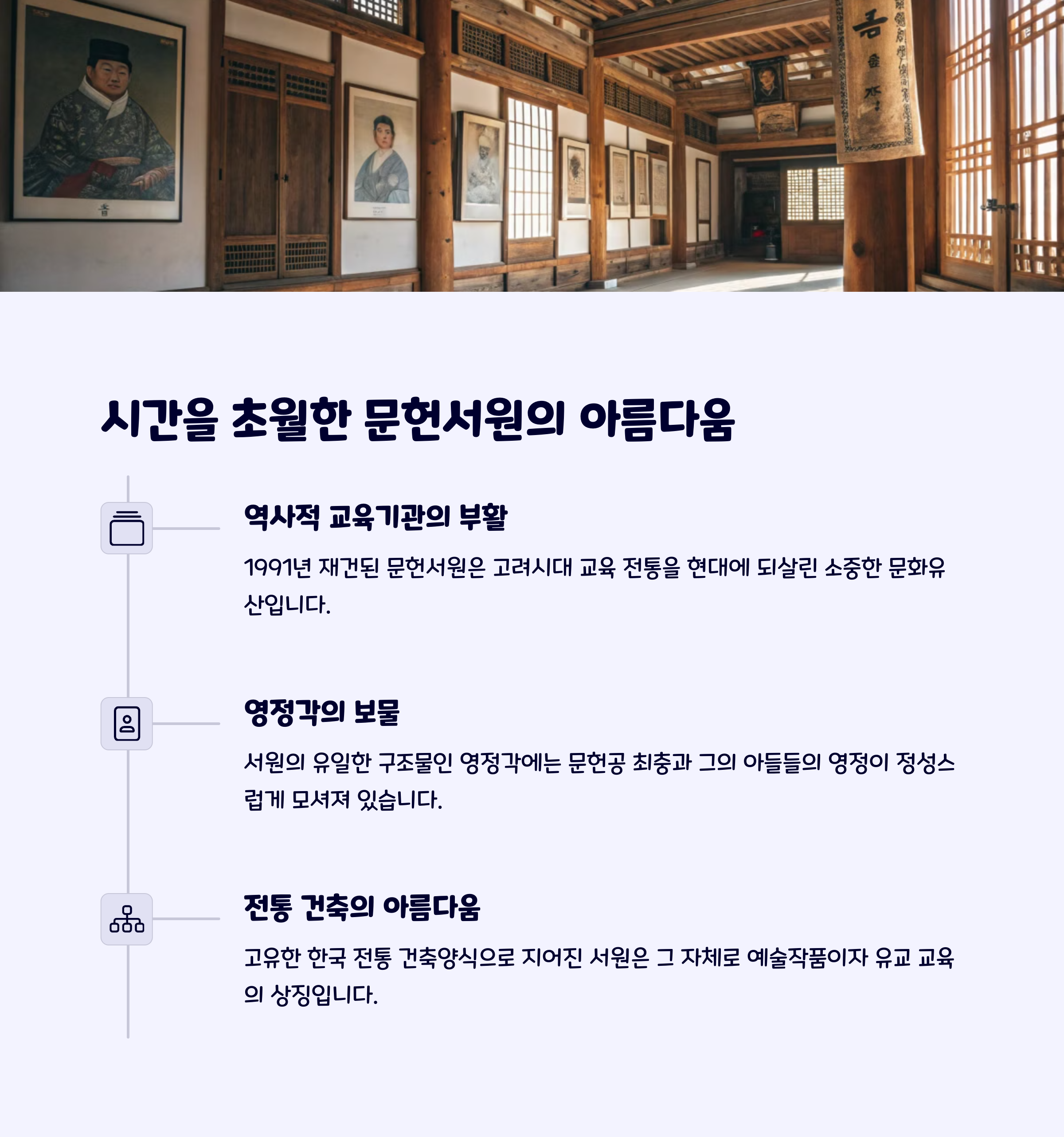 내부에는 문헌공 최충의 영정이 봉안되어 있으며, 방문객들은 그의 생애와 업적을 돌아볼 수 있습니다.