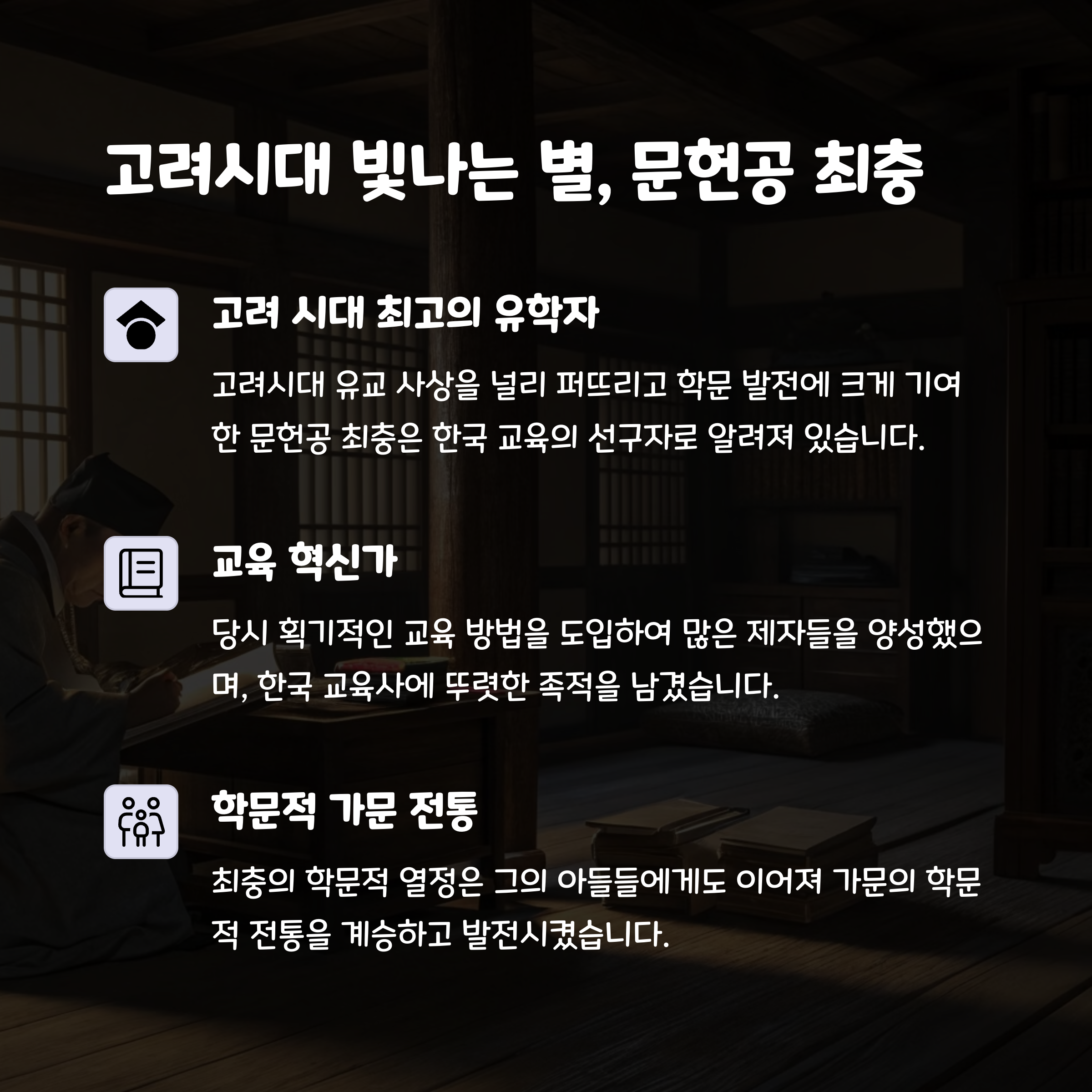 최충의 생애와 유교 교육의 가치를 이해할 수 있는 기회를 제공합니다.