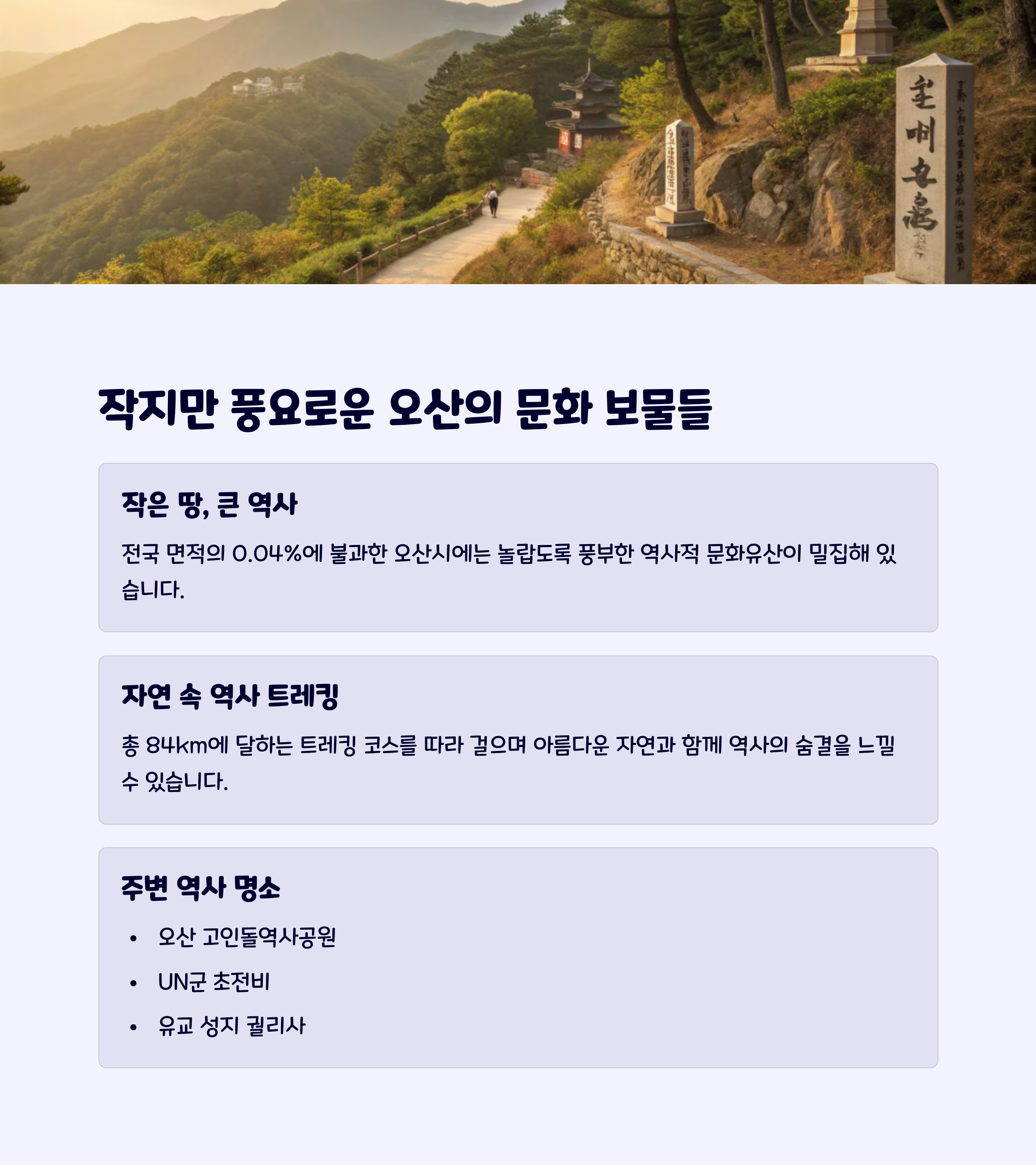 오산시는 작은 면적 내에 다수의 역사적 유산과 문화재가 분포하고 있어, 트레킹 루트를 짜기에 안성맞춤입니다.
