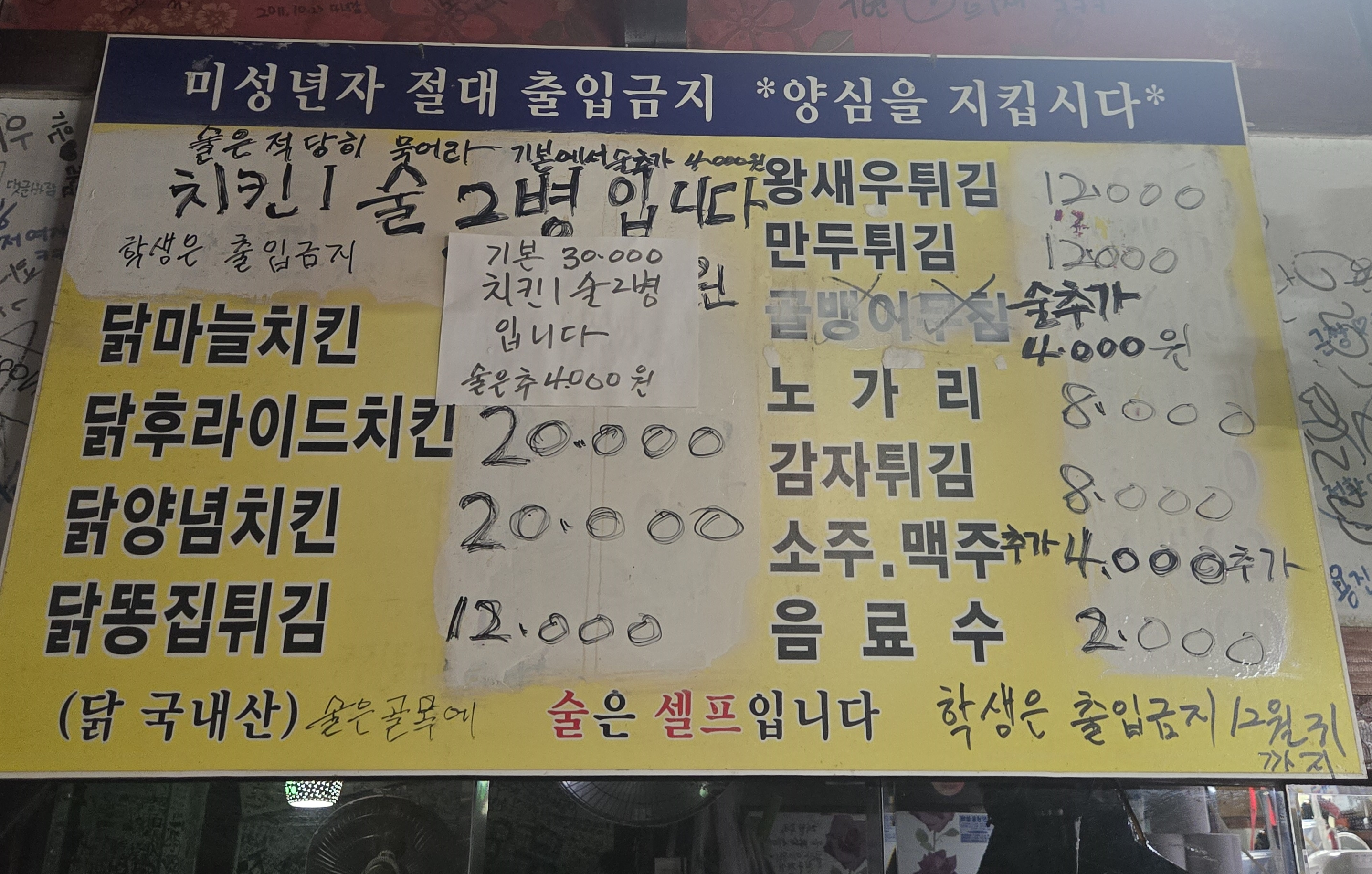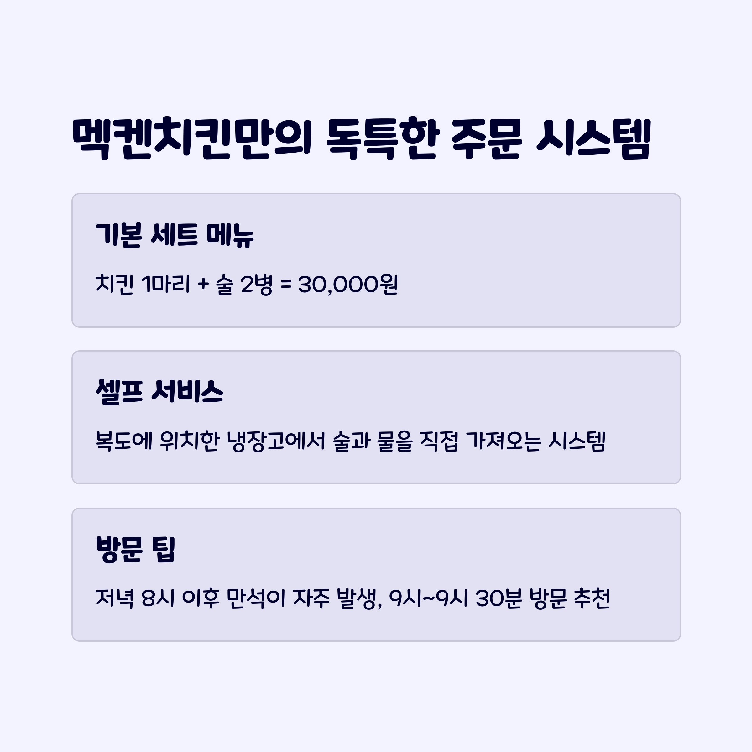 치킨과 술을 함께 주문해야만 하는 독특한 규칙은 방문객들에게 강한 인상을 남깁니다.