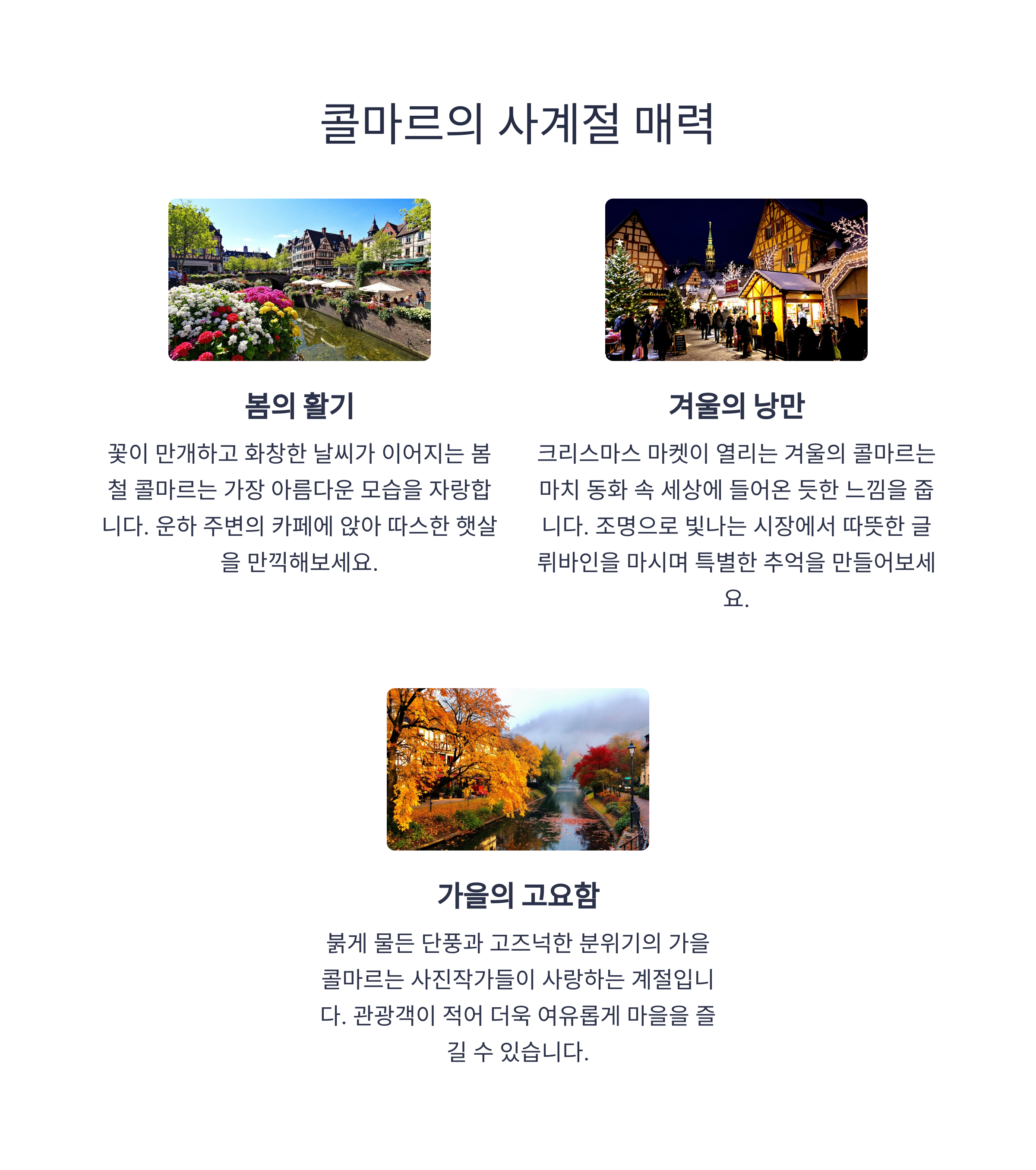 콜마르는 사계절 내내 매력적이지만 봄과 가을이 가장 아름답습니다. 겨울에는 크리스마스 마켓이 열려 낭만적인 분위기를 만끽할 수 있습니다.