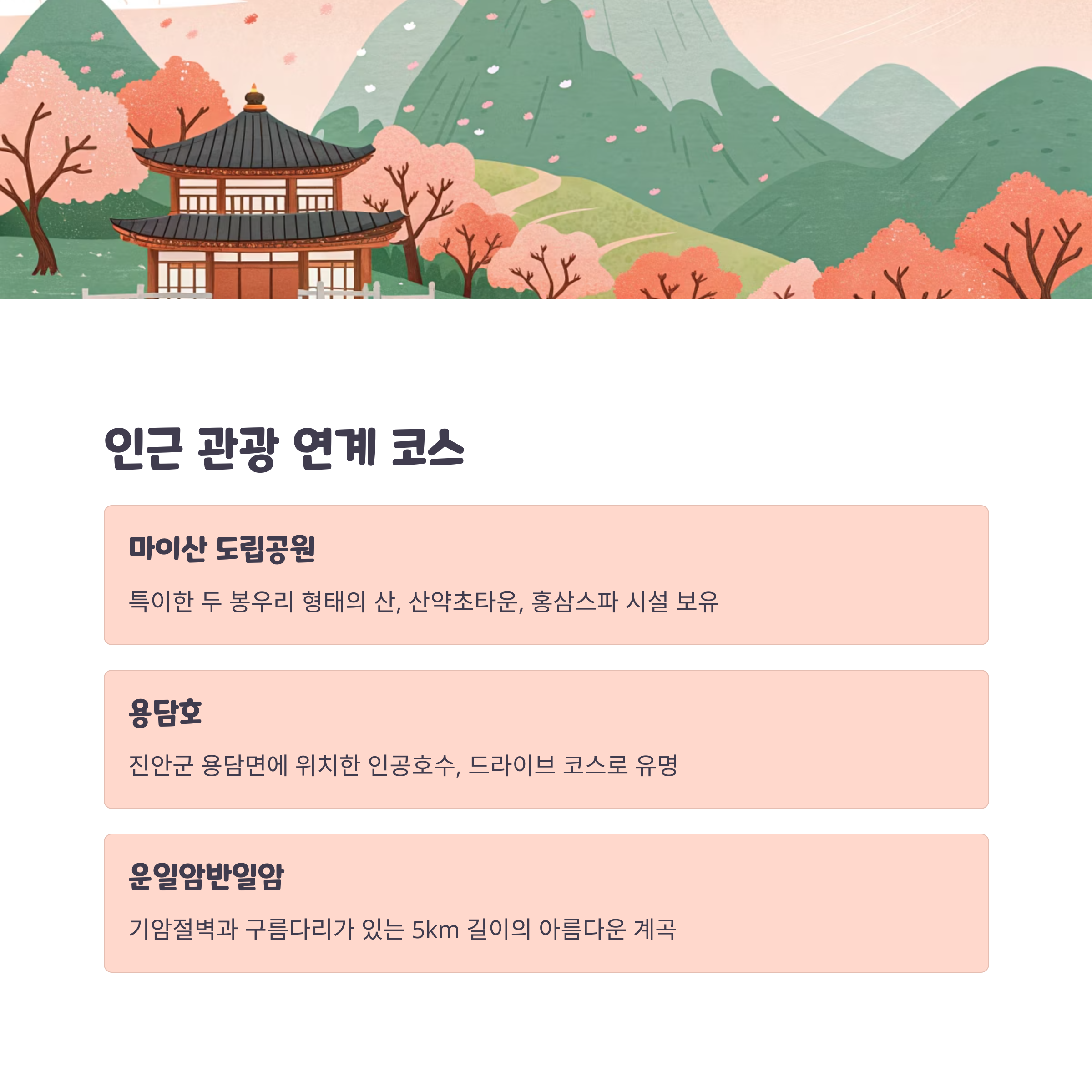 주변 관광지와 연계하면 하루 코스로도 충분히 알차게 즐길 수 있습니다. 마이산 도립공원은 특이한 두 봉우리로 유명한 산으로, 등산 외에도 산약초타운, 홍삼스파 등의 시설을 갖추고 있습니다. 용담호는 진안군 용담면에 위치한 인공호수로, 드라이브 코스로 유명하며, 운일암반일암은 기암절벽과 구름다리로 구성된 5km 길이의 계곡으로 자연의 감동을 선사합니다.
