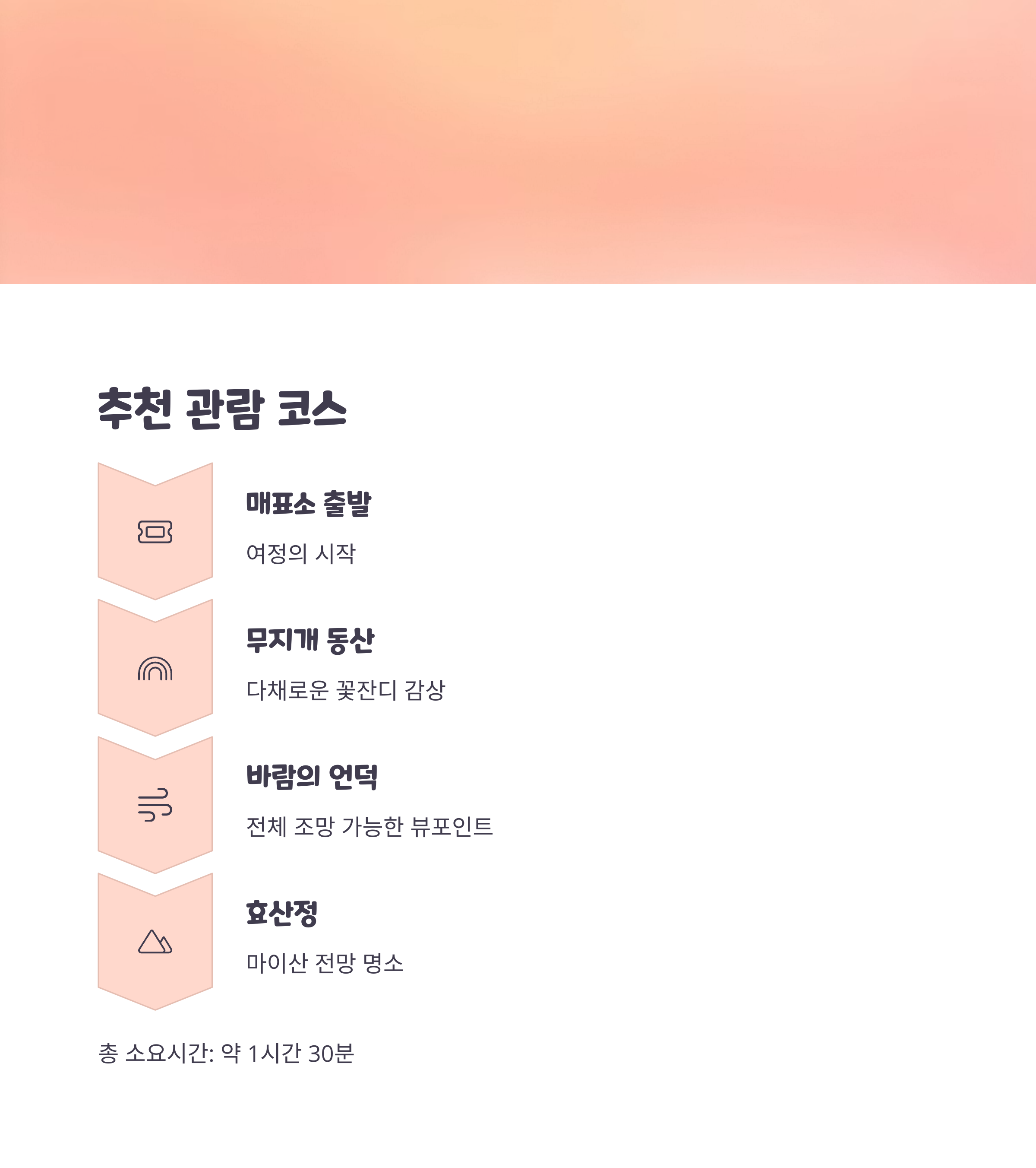 진안 꽃잔디동산은 지형적 특성과 풍경을 고려하여 다양한 산책 코스를 제공하고 있습니다. 기본 코스는 매표소를 출발해 무지개 동산, 바람의 언덕, 꽃잔디 고원길, 효산정을 지나 하산하는 순서로 구성되어 있으며, 약 1시간 30분이 소요됩니다.