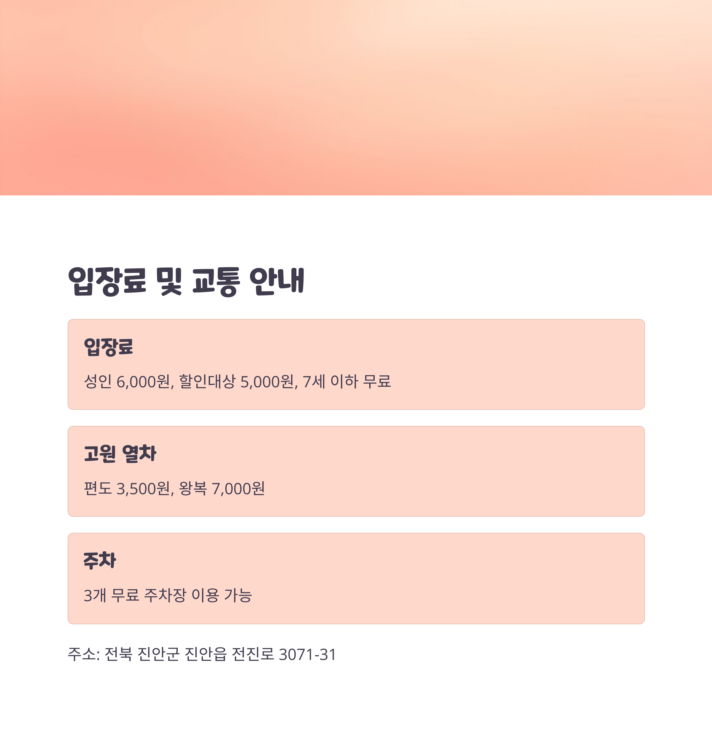 주소는 전북 진안군 진안읍 전진로 3071-31이며, 차량 이용 시 효산재카페 주차장, 꽃잔디동산 주차장, 대형버스 전용 주차장 등 3개의 무료 주차장을 이용할 수 있습니다. 주차 안내 요원이 상시 대기하여 방문객의 동선을 돕고 있어 이용이 매우 편리합니다.