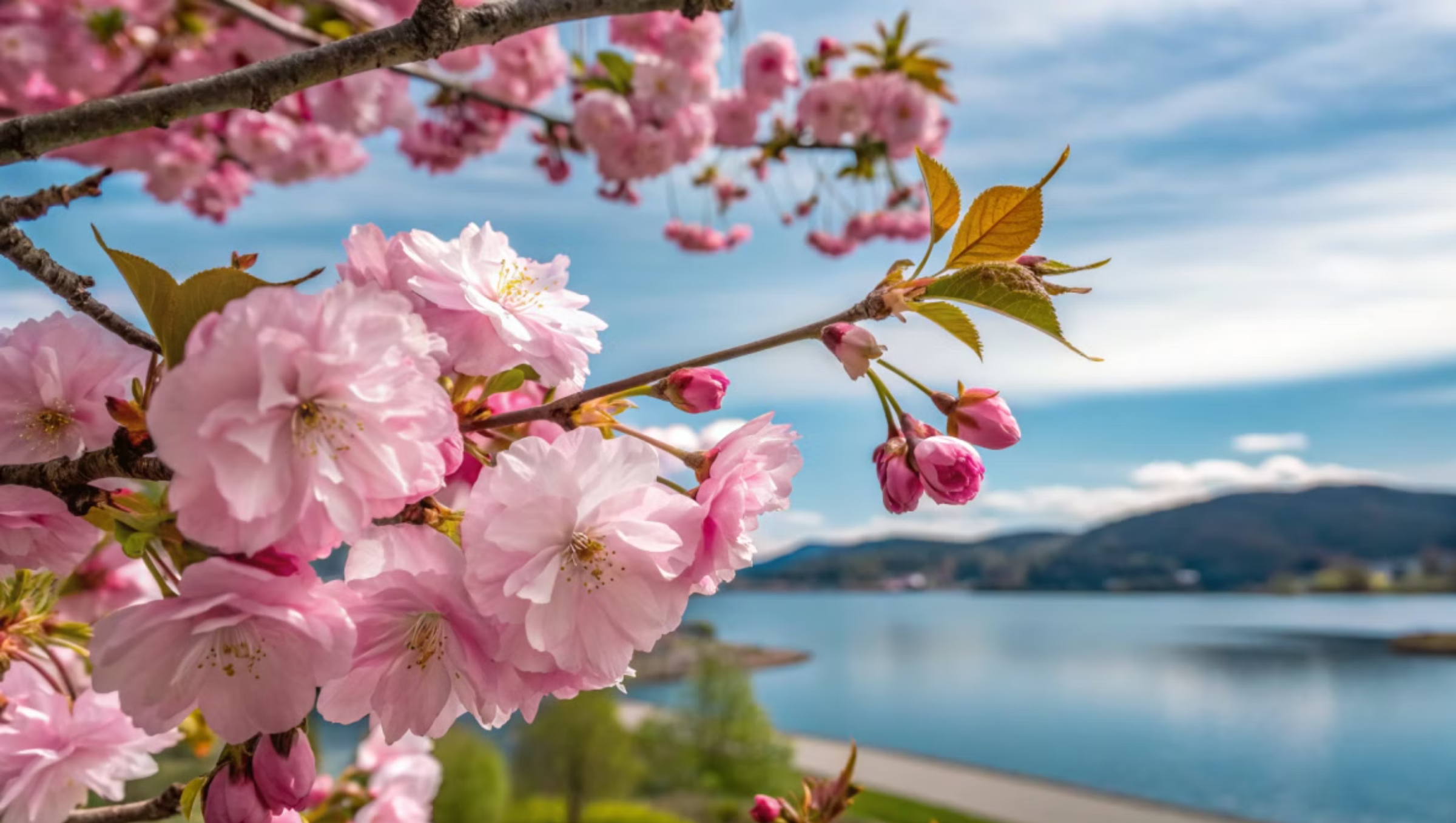 맑은 호수와 겹벚꽃이 어우러지는 봄날 풍경은 정말 환상적입니다.
