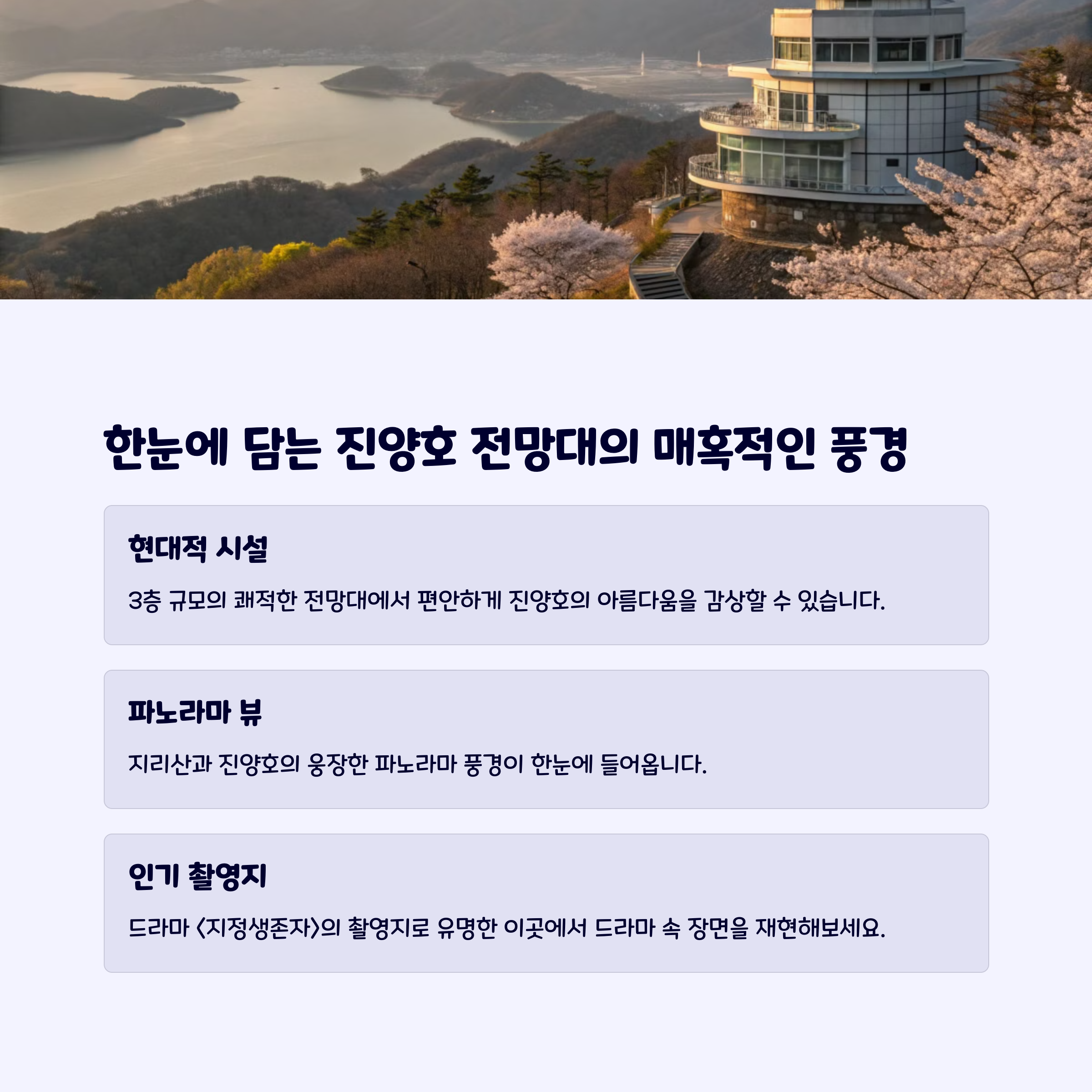 전망대에서는 진양호의 수려한 전경과 멀리 지리산 능선을 한눈에 조망할 수 있습니다.