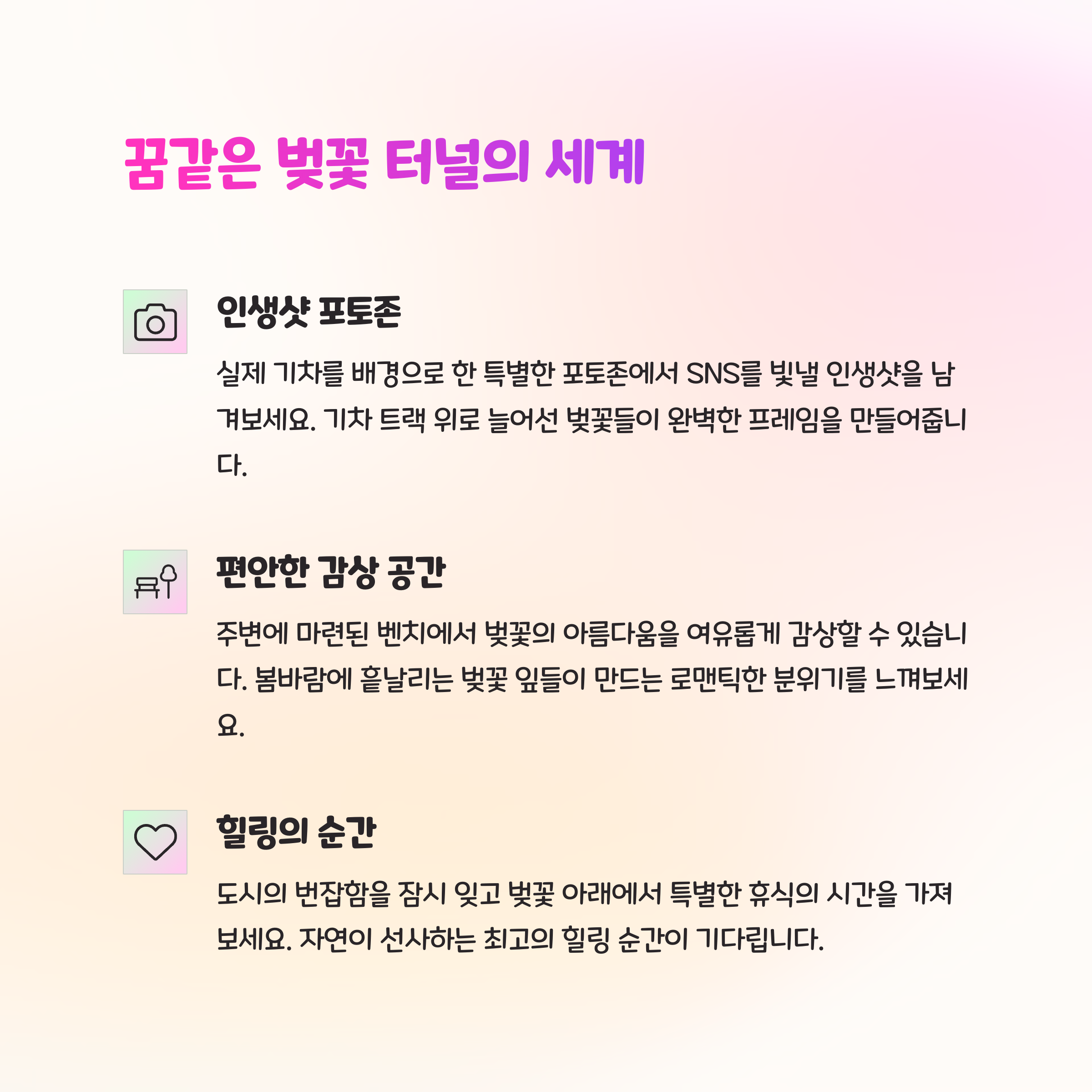 편안한 기차 포토존과 벚꽃 터널은 사진 찍기에 최적입니다.