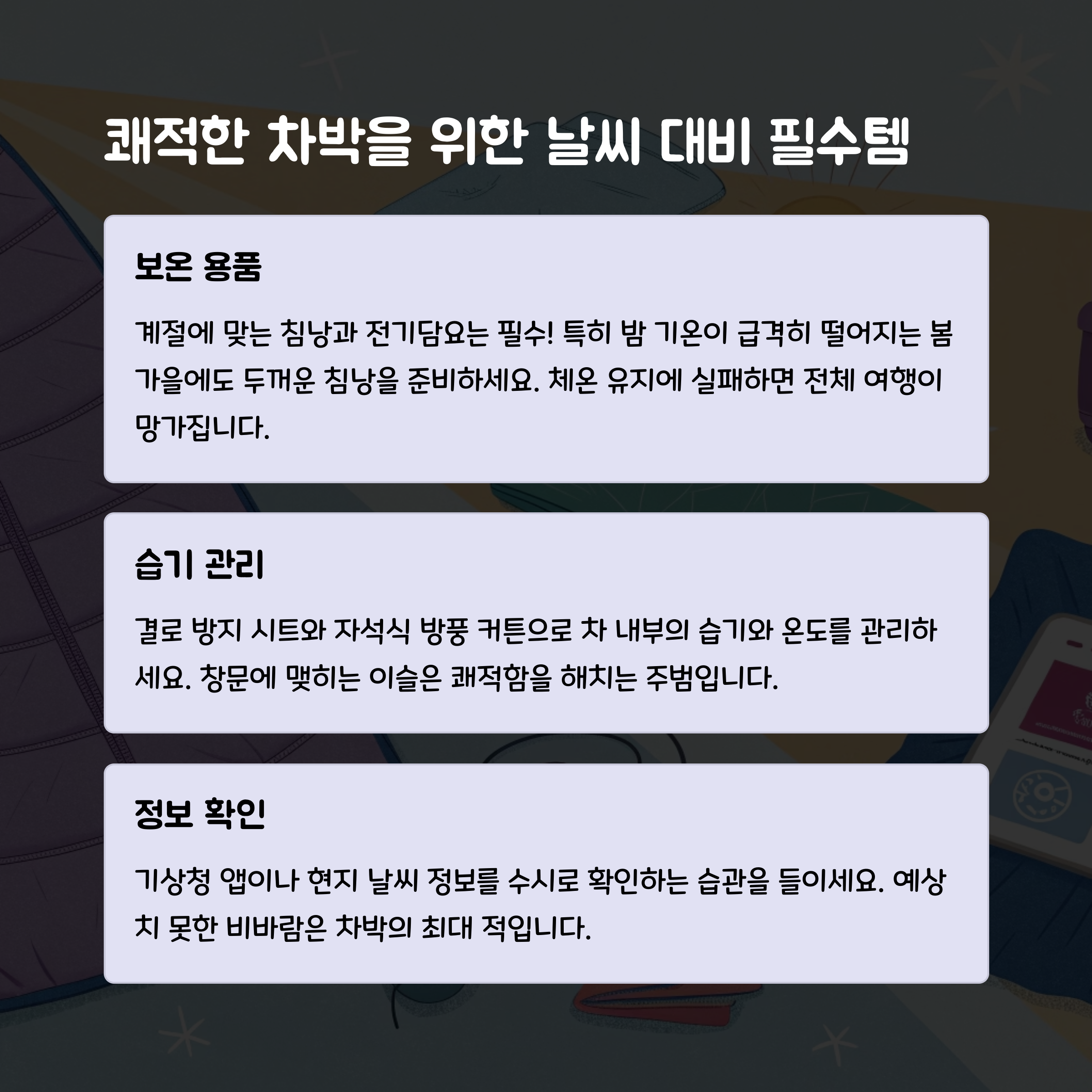 쾌적한 차박을 경험할 수 있습니다. 기상청 앱이나 현지 날씨 정보를 수시로 확인하는 습관도 중요합니다.