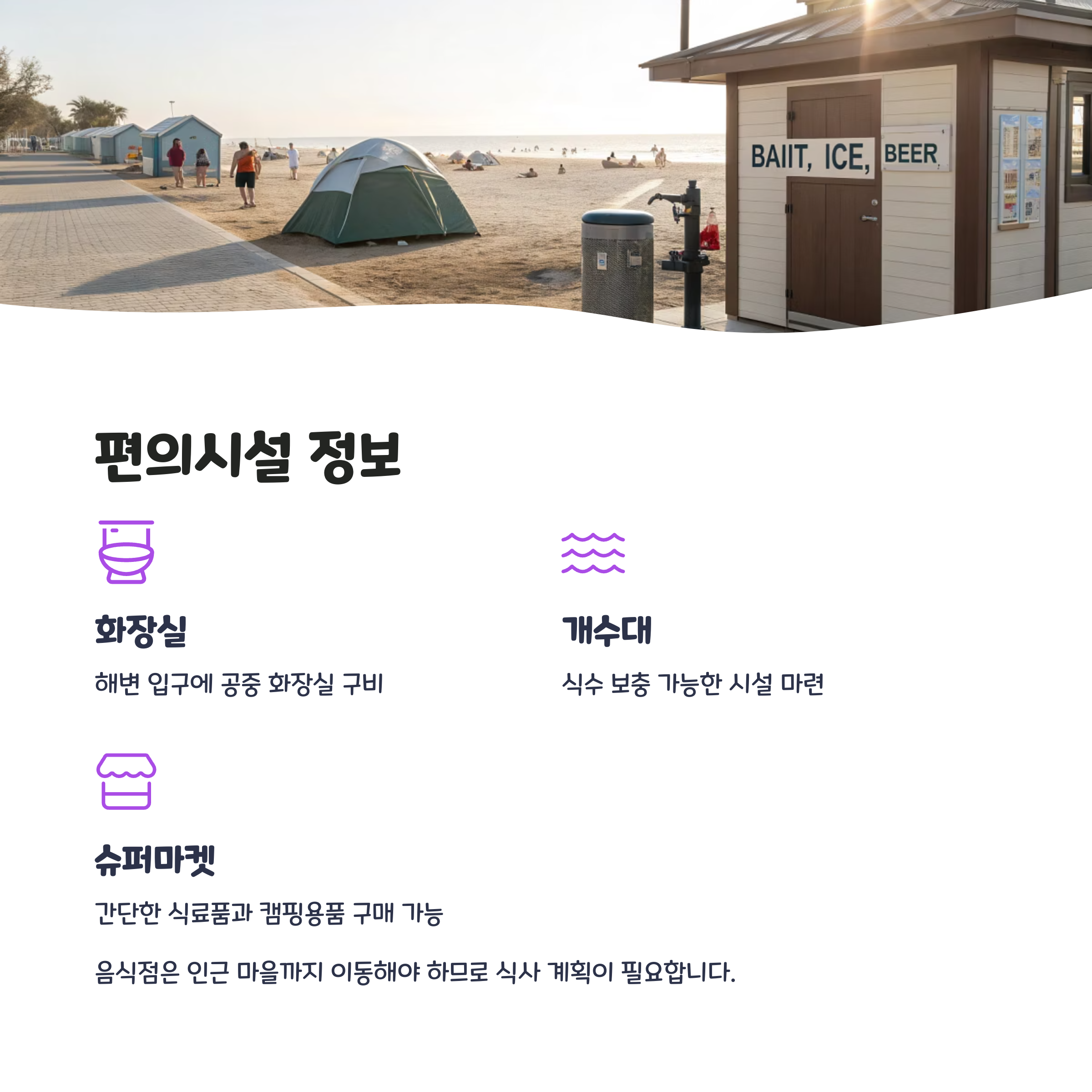 해수욕장 인근에는 간이 슈퍼마켓이 있어 간단한 식료품과 캠핑 용품을 구할 수 있으며, 주변에는 ‘샛별여행펜션’과 같은 숙박업소도 운영되고 있어 텐트 없이 숙박이 필요한 경우에도 이용이 가능합니다.