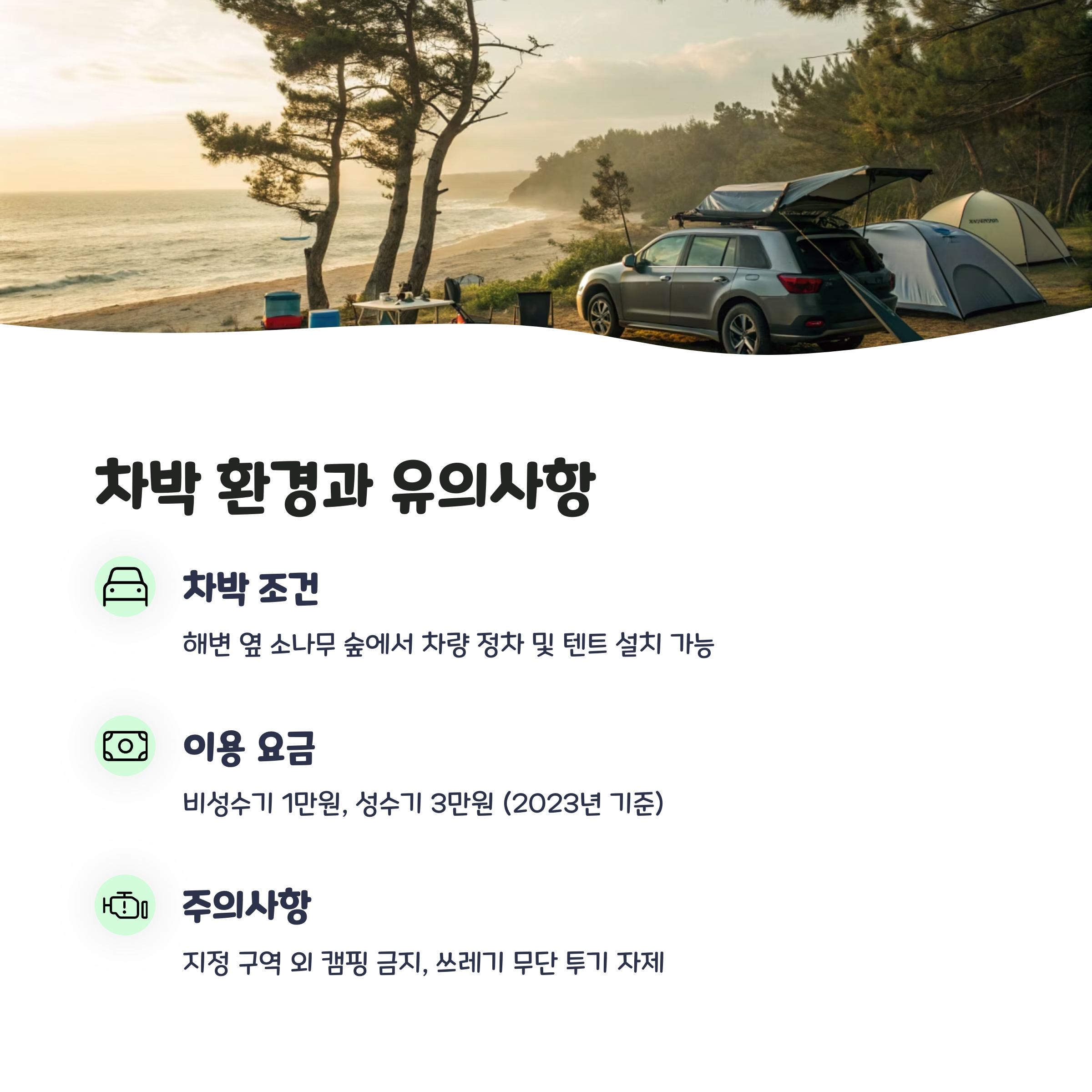 차박 시에는 자리를 잡기 좋은 해안도로변과 해변가 소나무 숲 양쪽 모두 텐트 및 차량 배치가 가능한 넓은 공간이 존재합니다. 다만, 지정 구역 외 캠핑은 금지되고 있으며, 쓰레기 무단 투기나 소음 발생 등 비매너 행위는 지역 주민과 방문객 모두의 불쾌감을 살 수 있으므로 자제해야 합니다.