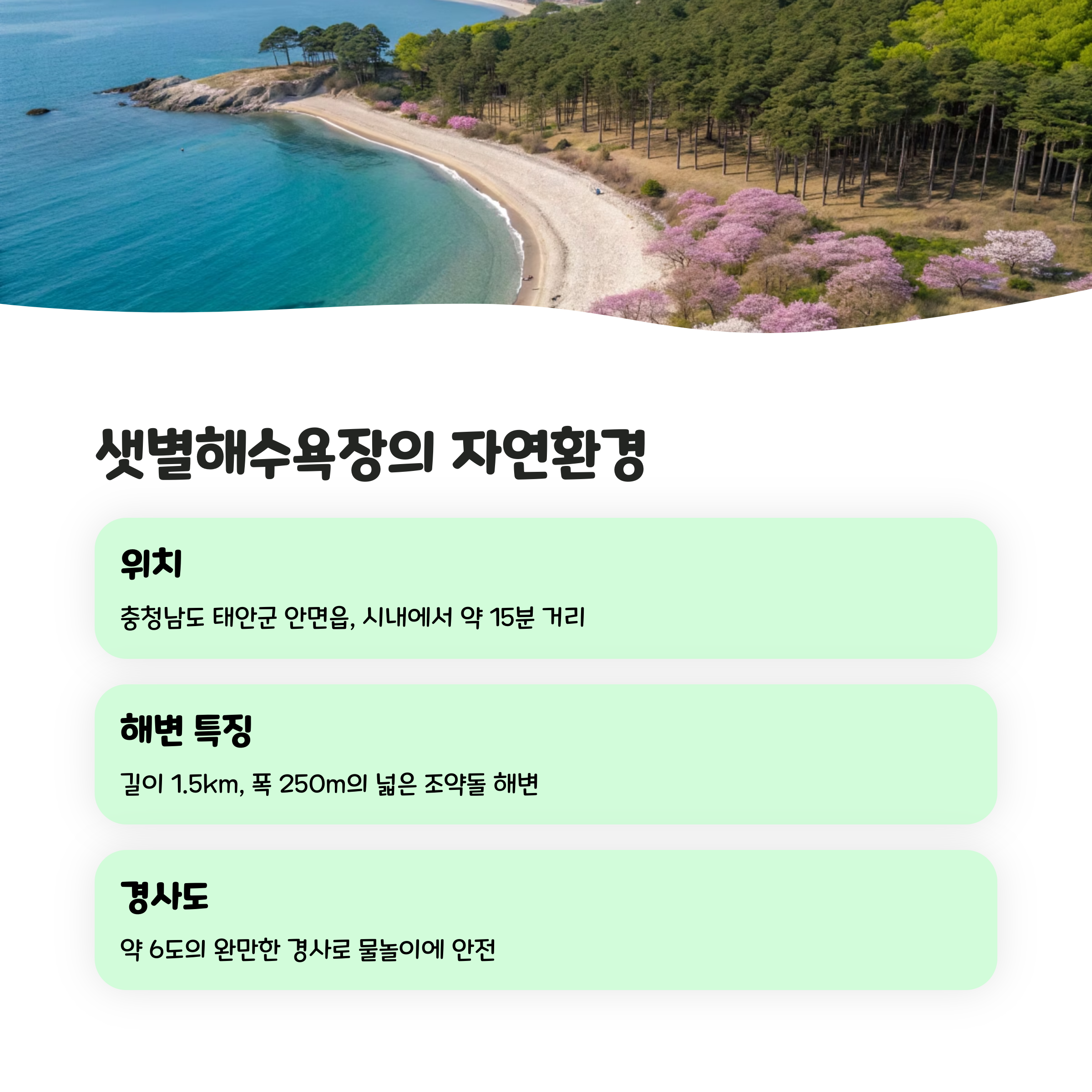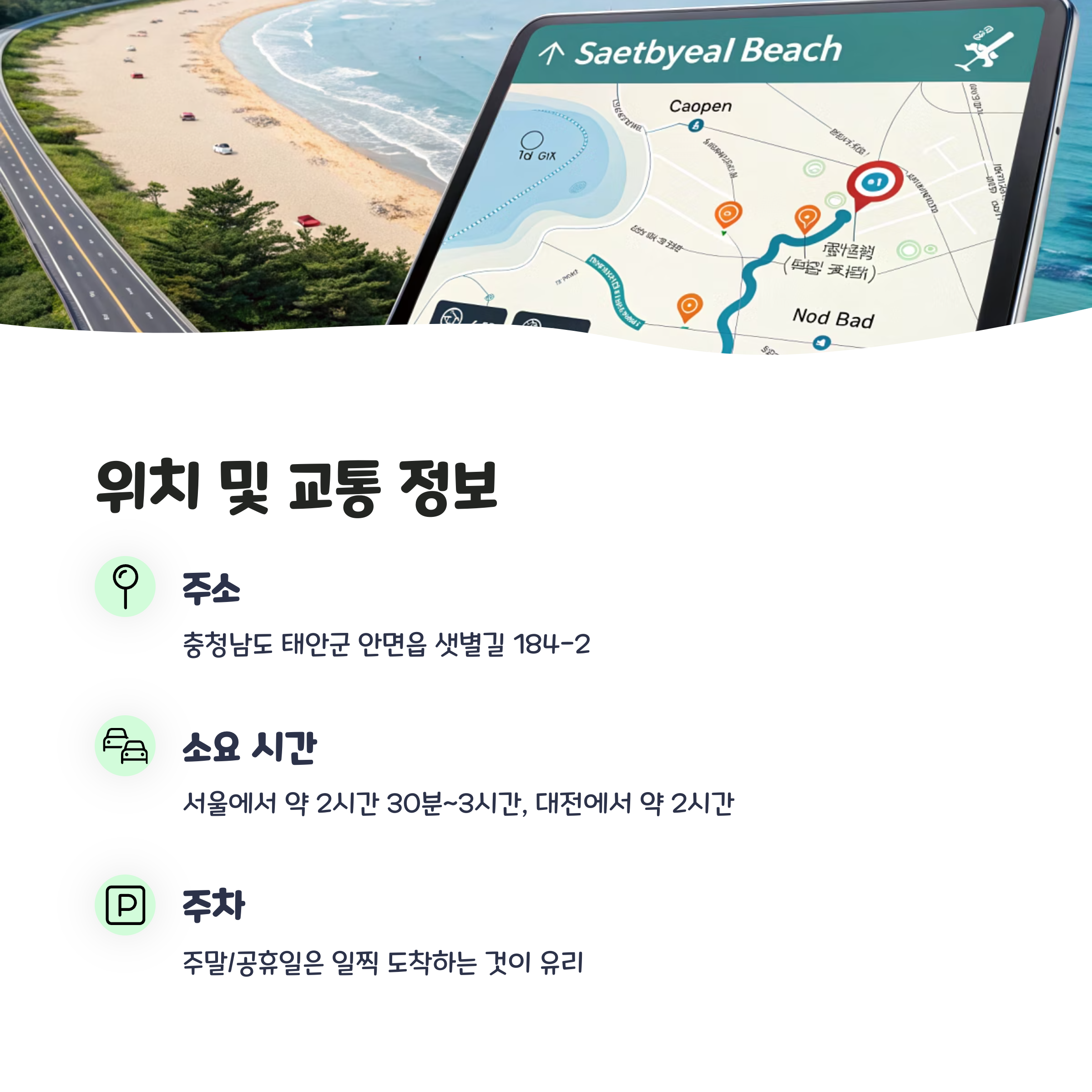 샛별해수욕장은 충청남도 태안군 안면읍에 위치한 비교적 잘 알려지지 않은 해변으로, 최근 차박족 사이에서 입소문을 타며 점점 인기를 끌고 있습니다. 해변은 자동차로 접근이 용이하며, 안면읍 시내에서 약 15분 내외의 거리로 주말 여행지로서의 접근성이 뛰어납니다.