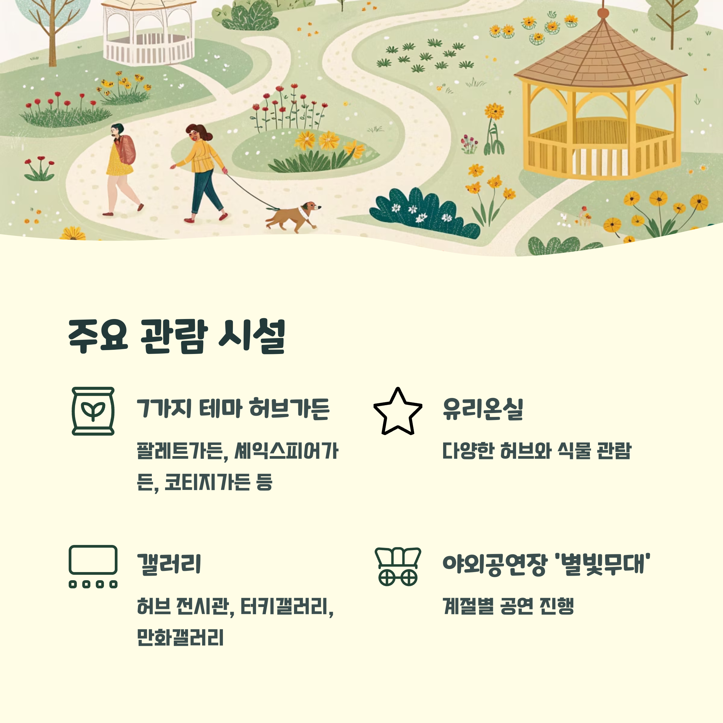 - 7개의 테마 허브가든: 팔레트가든, 셰익스피어가든, 코티지가든, 락가든, 나비가든, 마음의뜰, 어린이가든