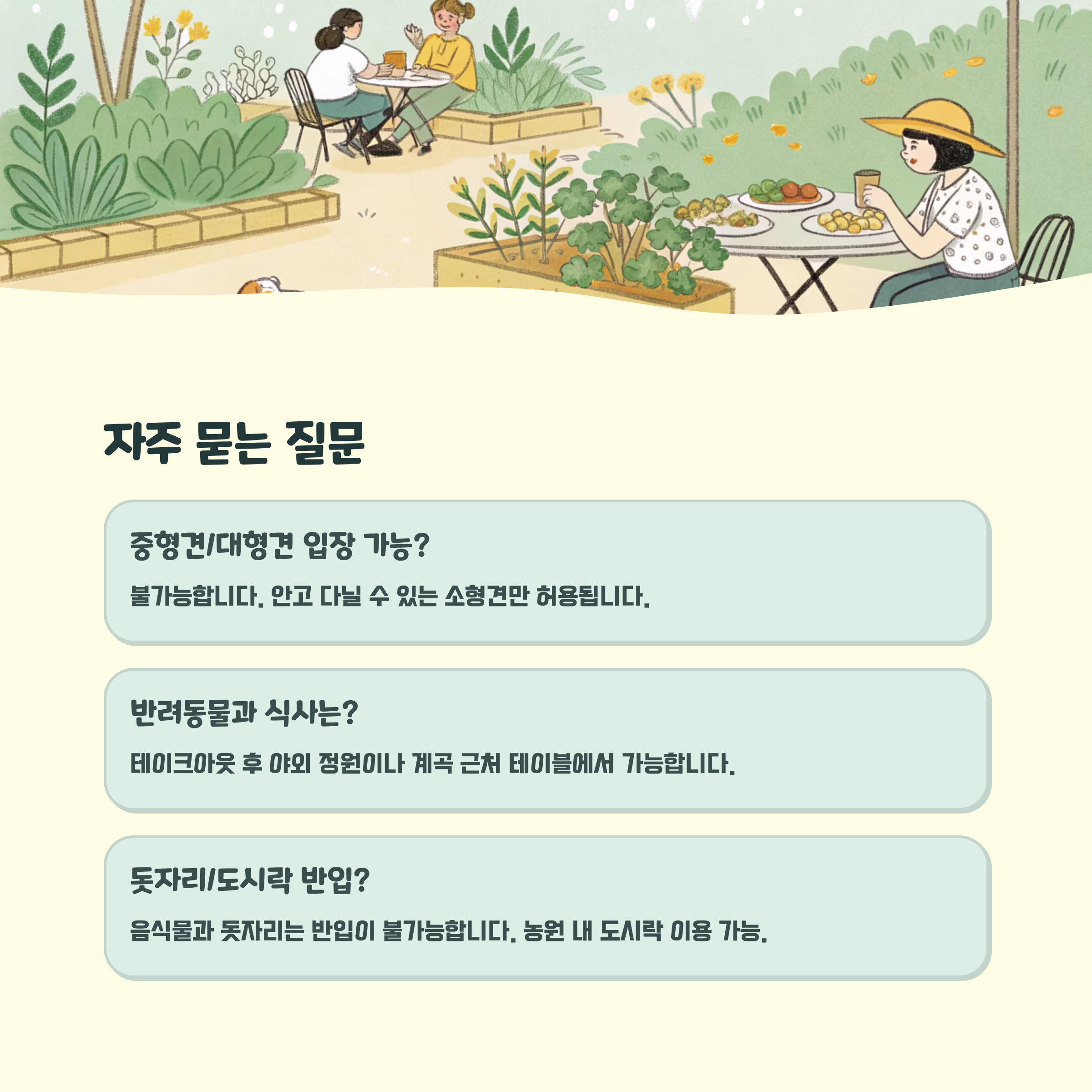 A5. 음식물과 돗자리는 반입이 불가능합니다. 다만, 농원 내 제공되는 도시락 테이크아웃을 이용해 야외에서 식사할 수 있습니다.