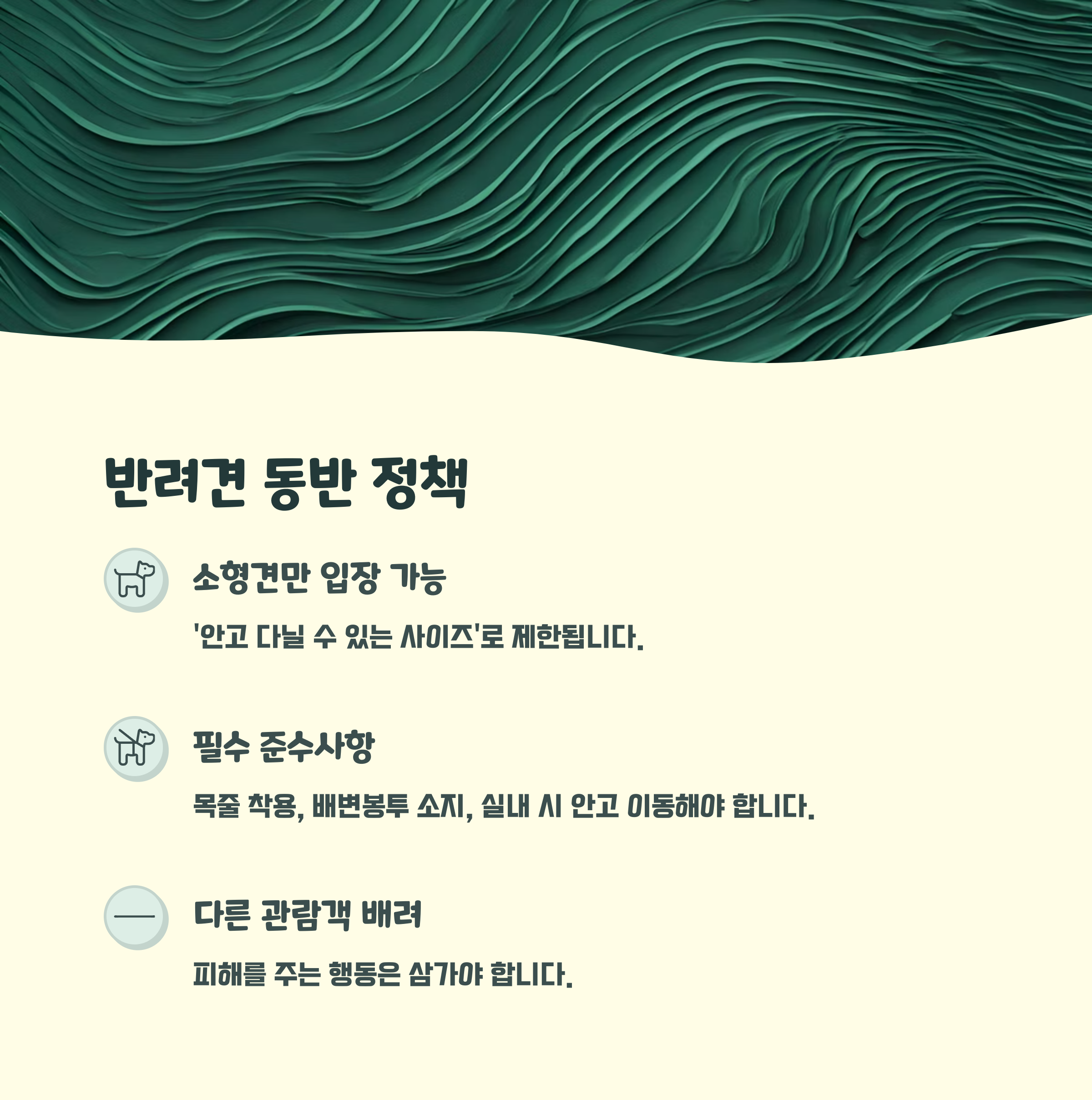 이 같은 규정은 반려동물의 안전뿐 아니라 모든 방문객의 쾌적한 관람을 위해 마련된 조치이며, 위반 시 출입 제한 등의 조치가 취해질 수 있습니다.