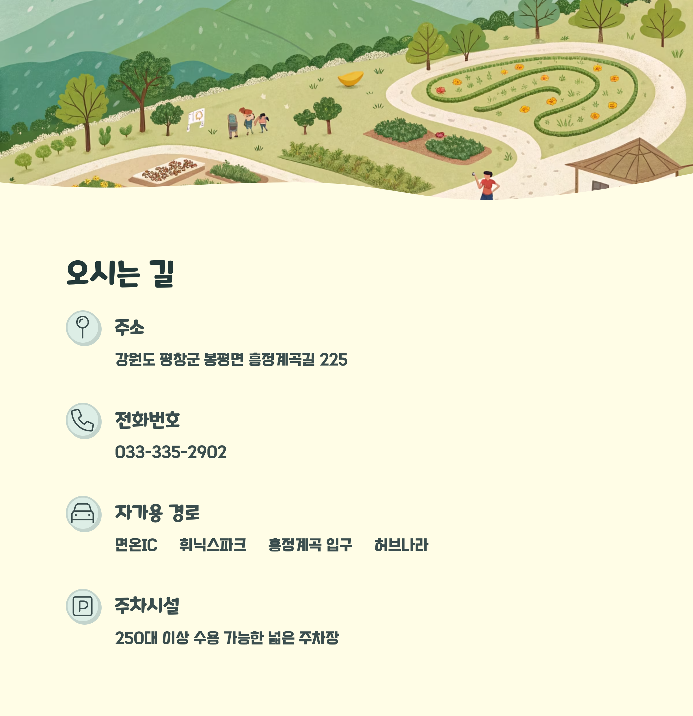 면온IC(4.8km) → 휘닉스파크(6km) → 흥정계곡 입구(3km) → 허브나라 도착