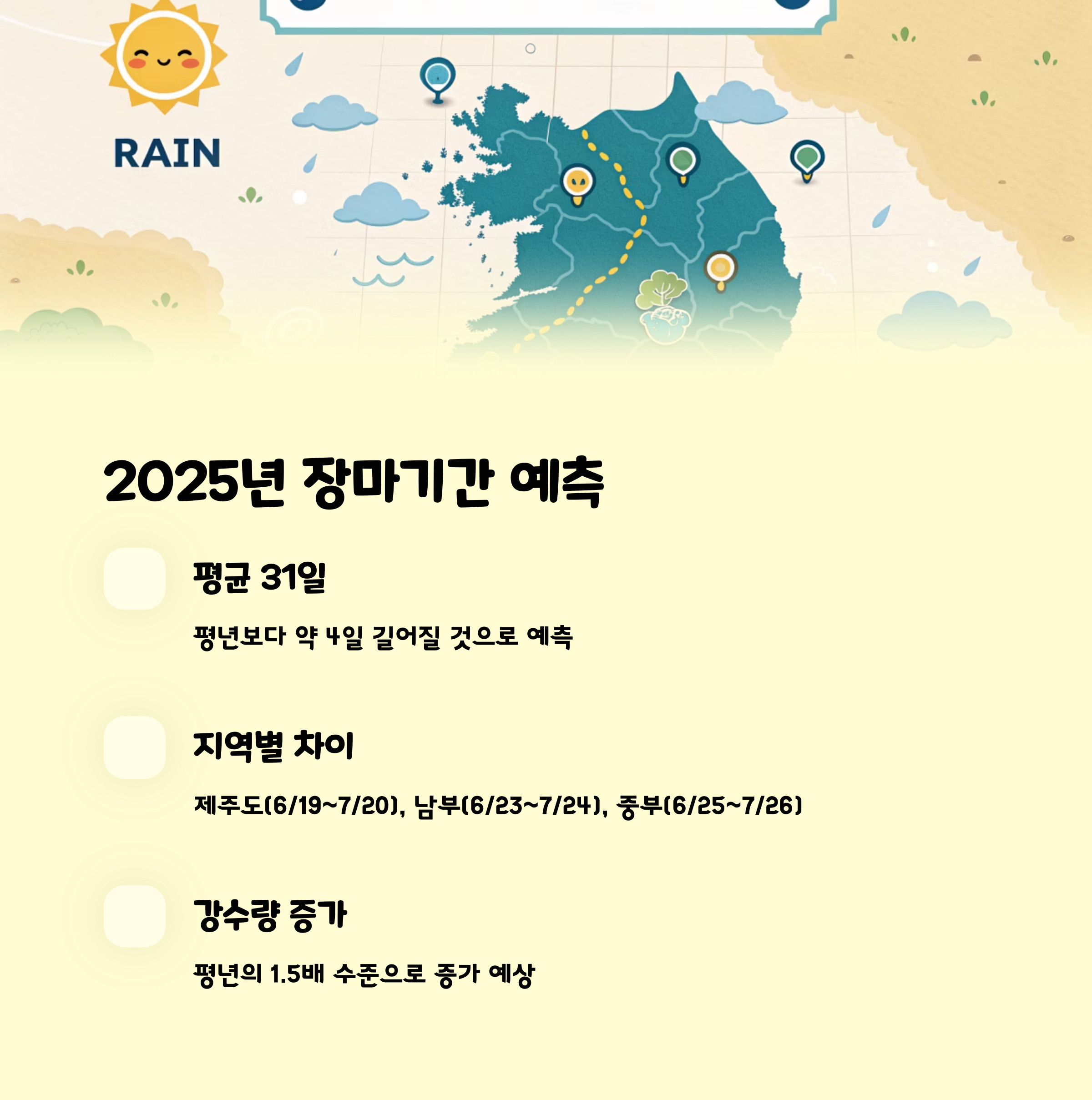 2025년 장마는 평년보다 길고 강수량이 많을 것으로 예보돼 사전 대비가 중요합니다. 제주도를 시작으로 전국이 6월 중순부터 7월 하순까지 장마 영향을 받을 것으로 보이며, 중부지방의 경우 집중호우가 잦을 것으로 예상됩니다.