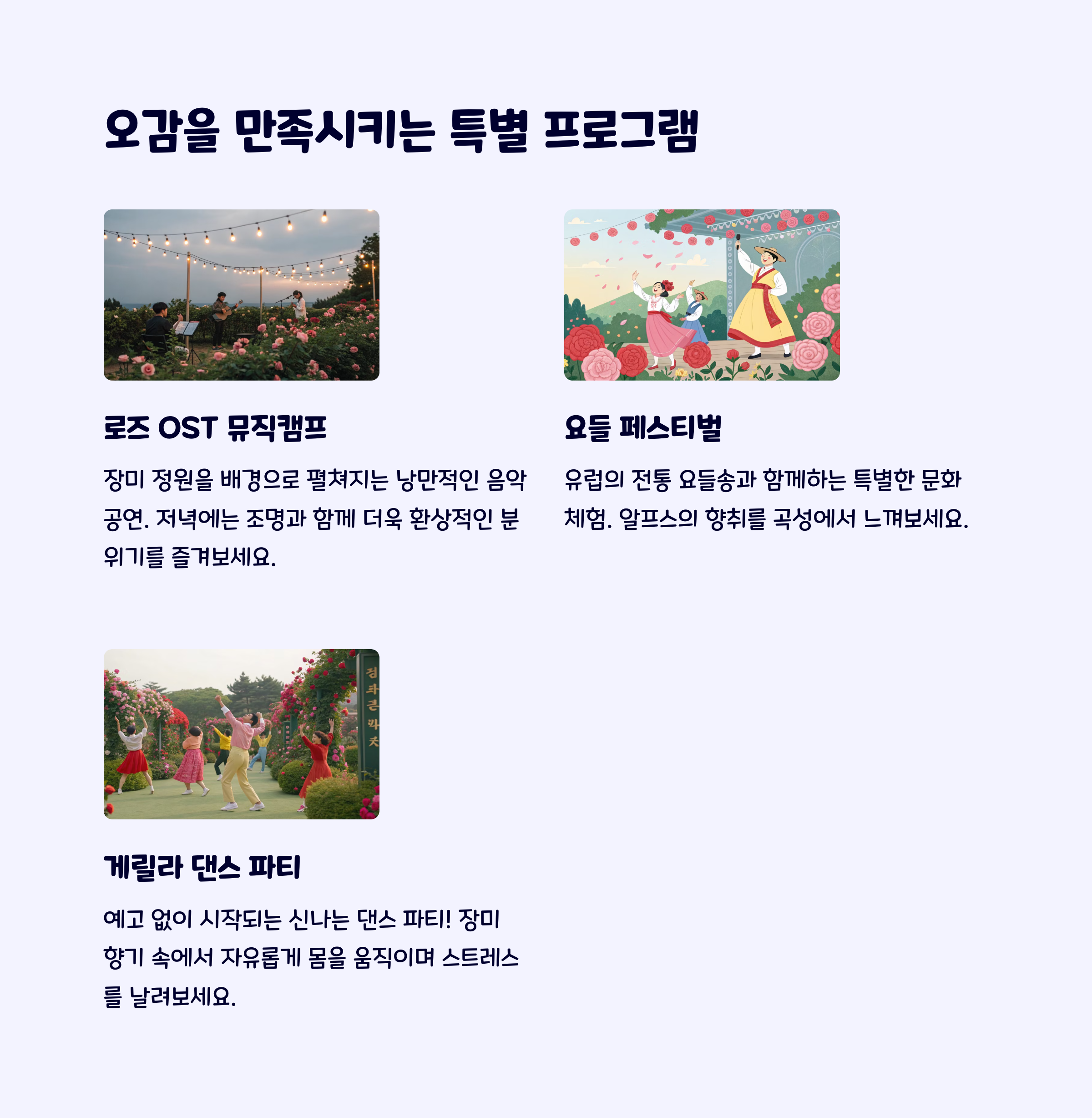 - 장미정원: 미로원·야간조명·터널 등 필수 관람