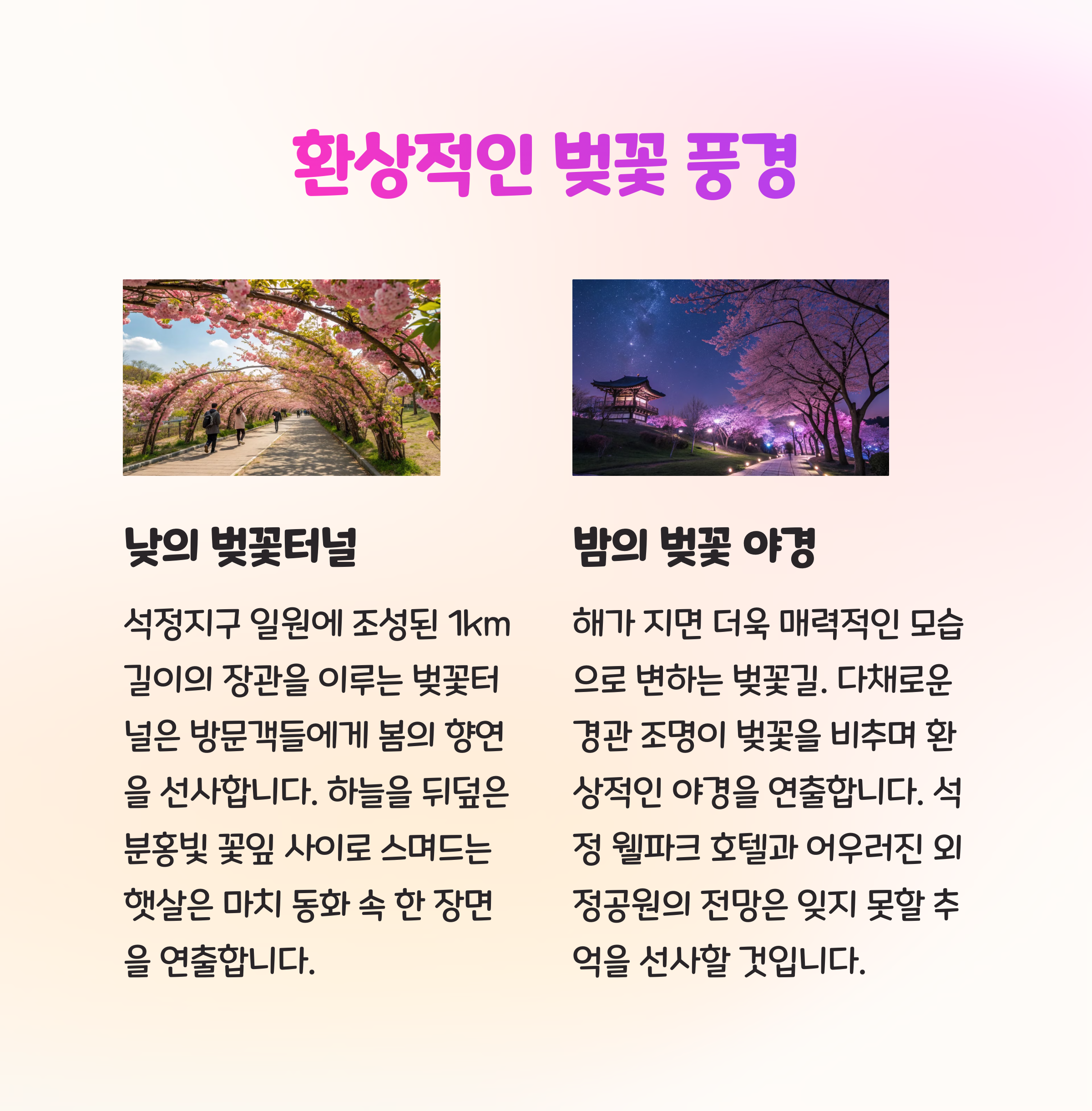 이곳에서는 약 1km의 벚꽃 터널과 2km에 이르는 벚꽃길이 펼쳐져, 마치 꽃 속을 걷는 듯한 기분을 선사하죠. 특히 야간에는 조명이 더해져 낮과는 또 다른 낭만적인 분위기를 느낄 수 있어요.