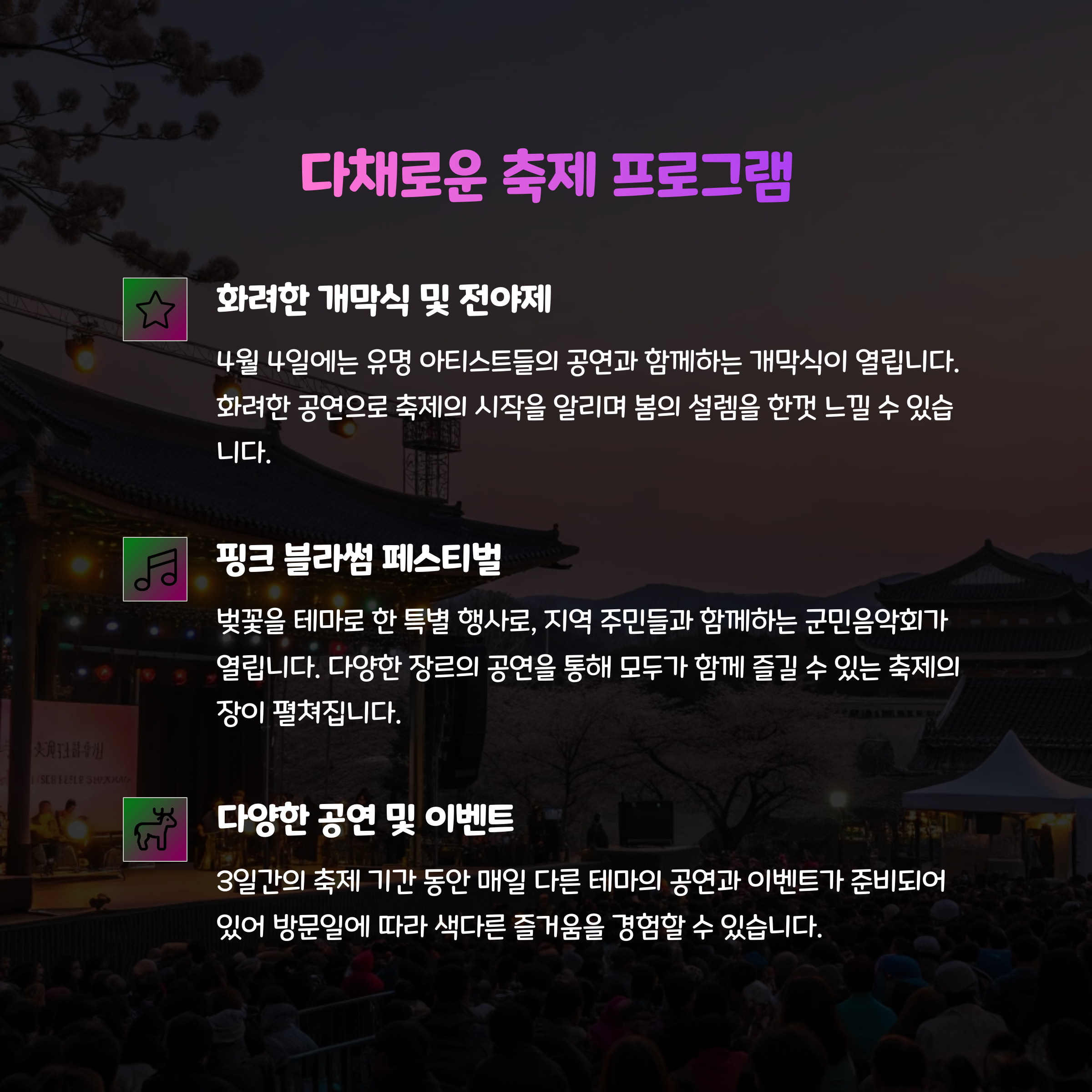 군민음악회, 핑크 블라썸 페스티벌, 전야제 등 | 무료 주차장, 셔틀버스, 야간 조명 운영 |