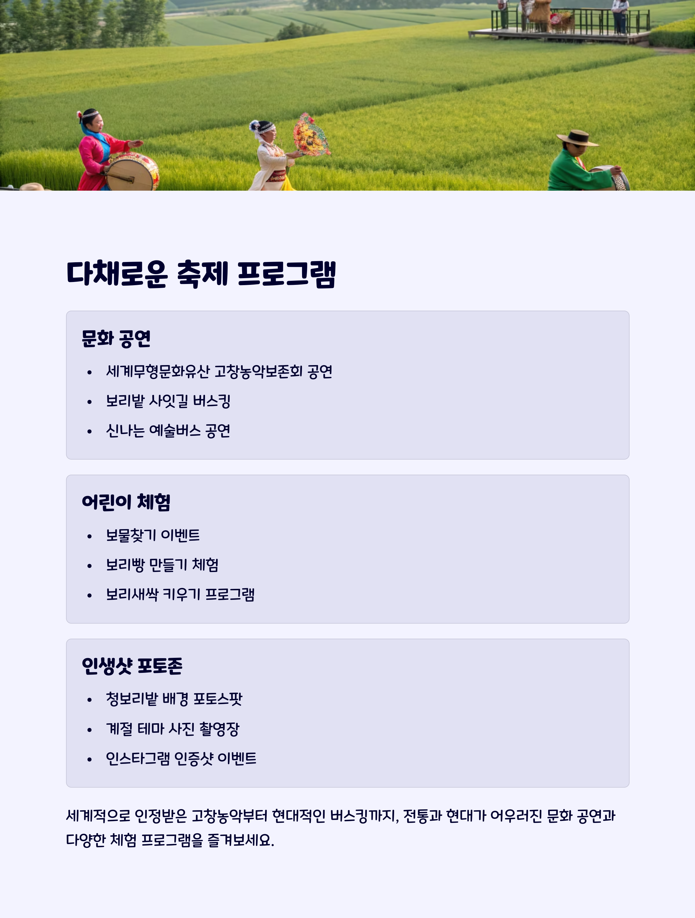 - 어린이 체험 프로그램 – 농촌 체험, 놀이터 등 가족 단위 프로그램