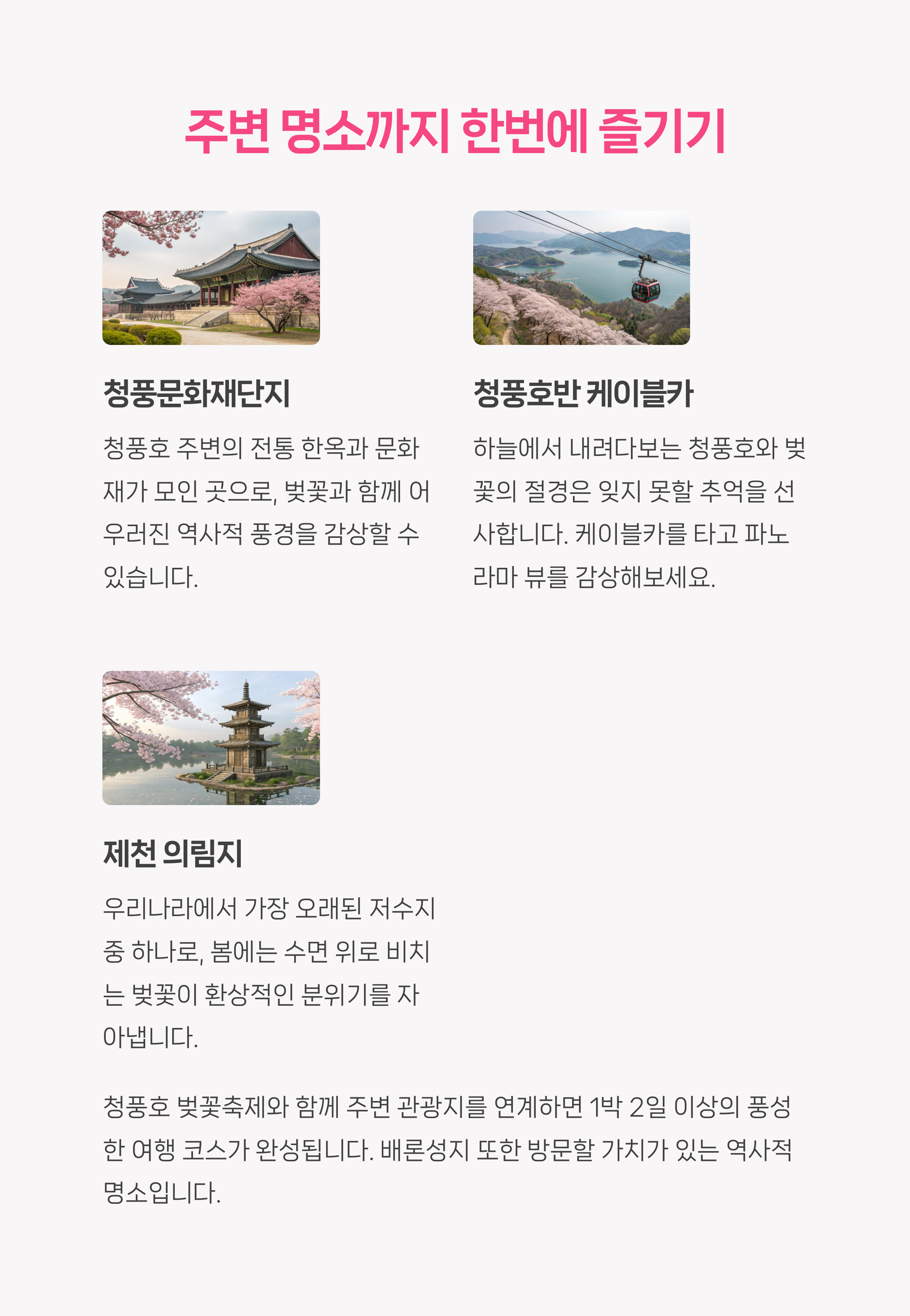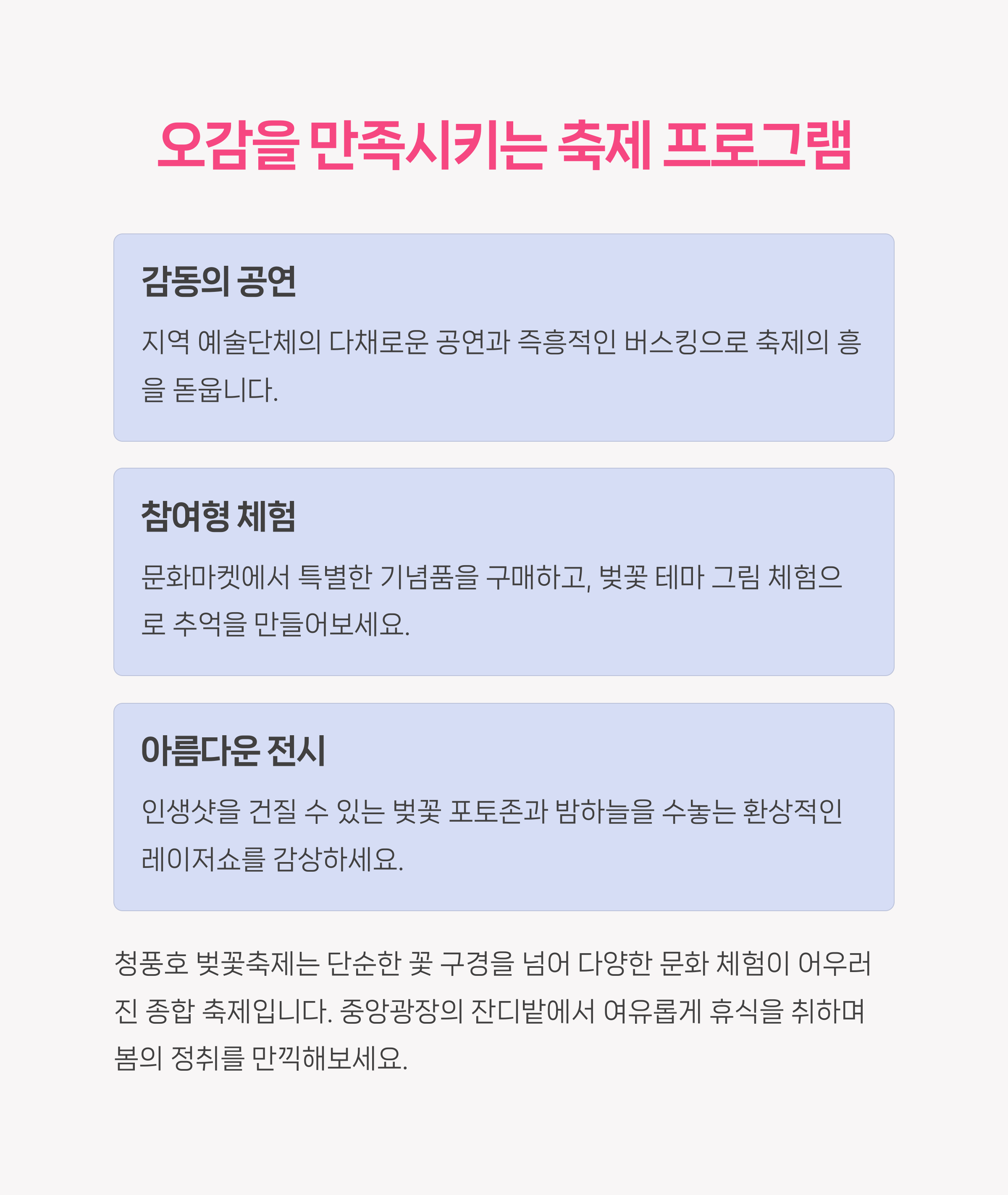 매년 봄이 되면 전국 곳곳에서 벚꽃 축제가 열리며 많은 이들의 기대를 모읍니다. 그중에서도 충청북도 제천시에 위치한 청풍호 벚꽃축제는 호반의 낭만과 화사한 벚꽃이 어우러진 장관으로 유명합니다.