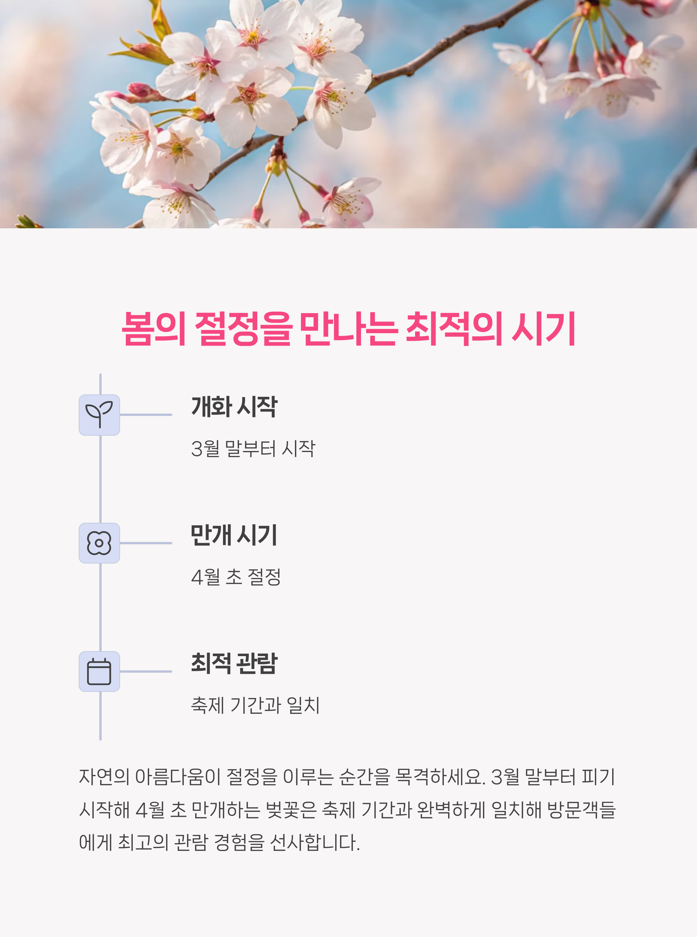 특히 벚꽃 개화 시기와 만개일에 맞춘 다양한 문화행사와 체험 프로그램이 예정되어 있어 방문 전 정확한 일정을 확인하는 것이 중요합니다.