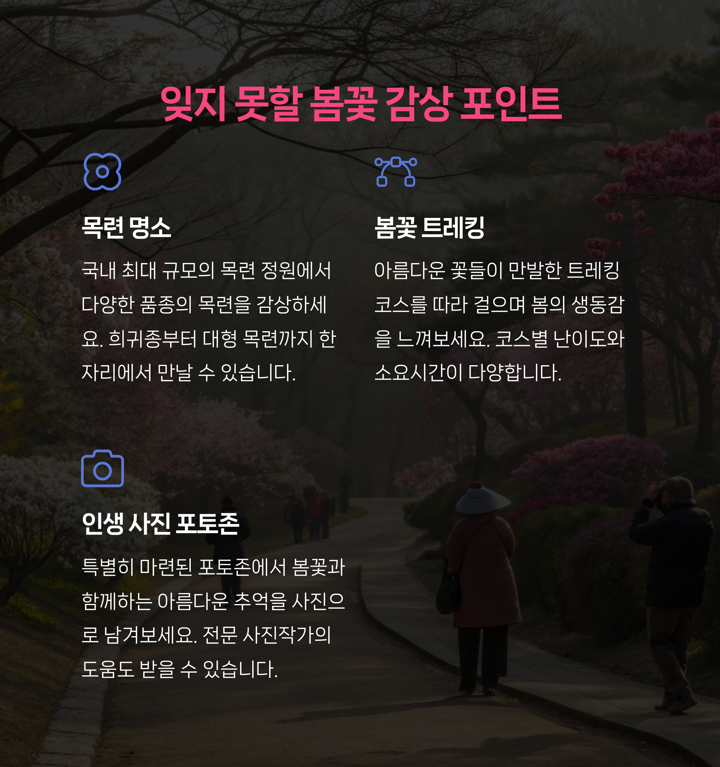 | 주요 프로그램 | 목련 산책, 가드너 해설, 체험행사 등 다양하게 준비됩니다. |