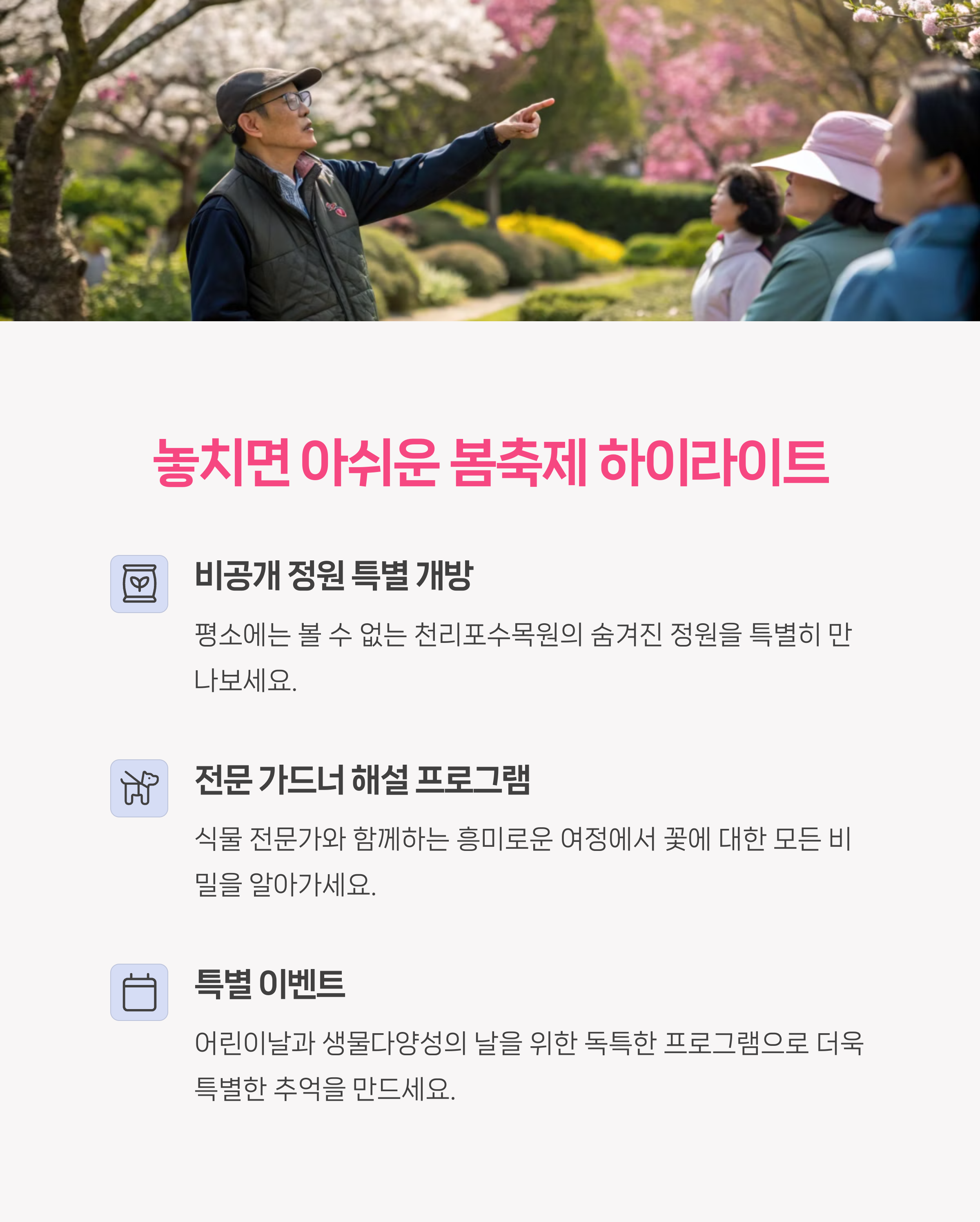 | 3월 28일부터 5월 31일까지 운영 | 사전 예약 시 비공개 정원 탐방 가능 | 해설, 교육, 생물 행사 등 다양하게 운영 |