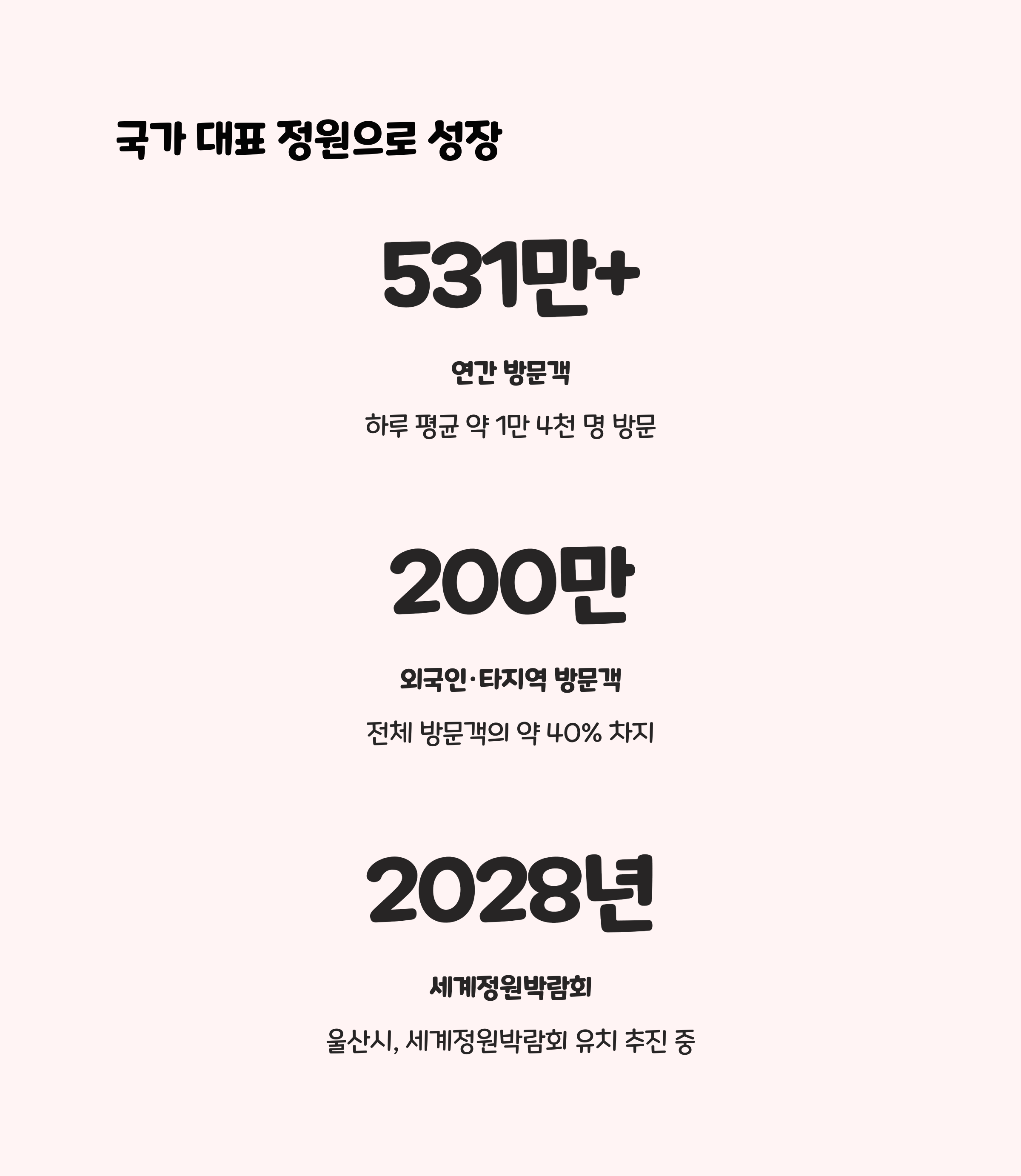 태화강 국가정원은 2019년 7월 대한민국 제2호 국가정원으로 지정된 이후, 매년 방문객 수가 꾸준히 증가하고 있습니다. 지난해에는 약 531만 5,836명의 방문객이 찾았으며, 하루 평균 약 1만 4천 명이 방문하는 국가 대표 정원으로 자리 잡았습니다.