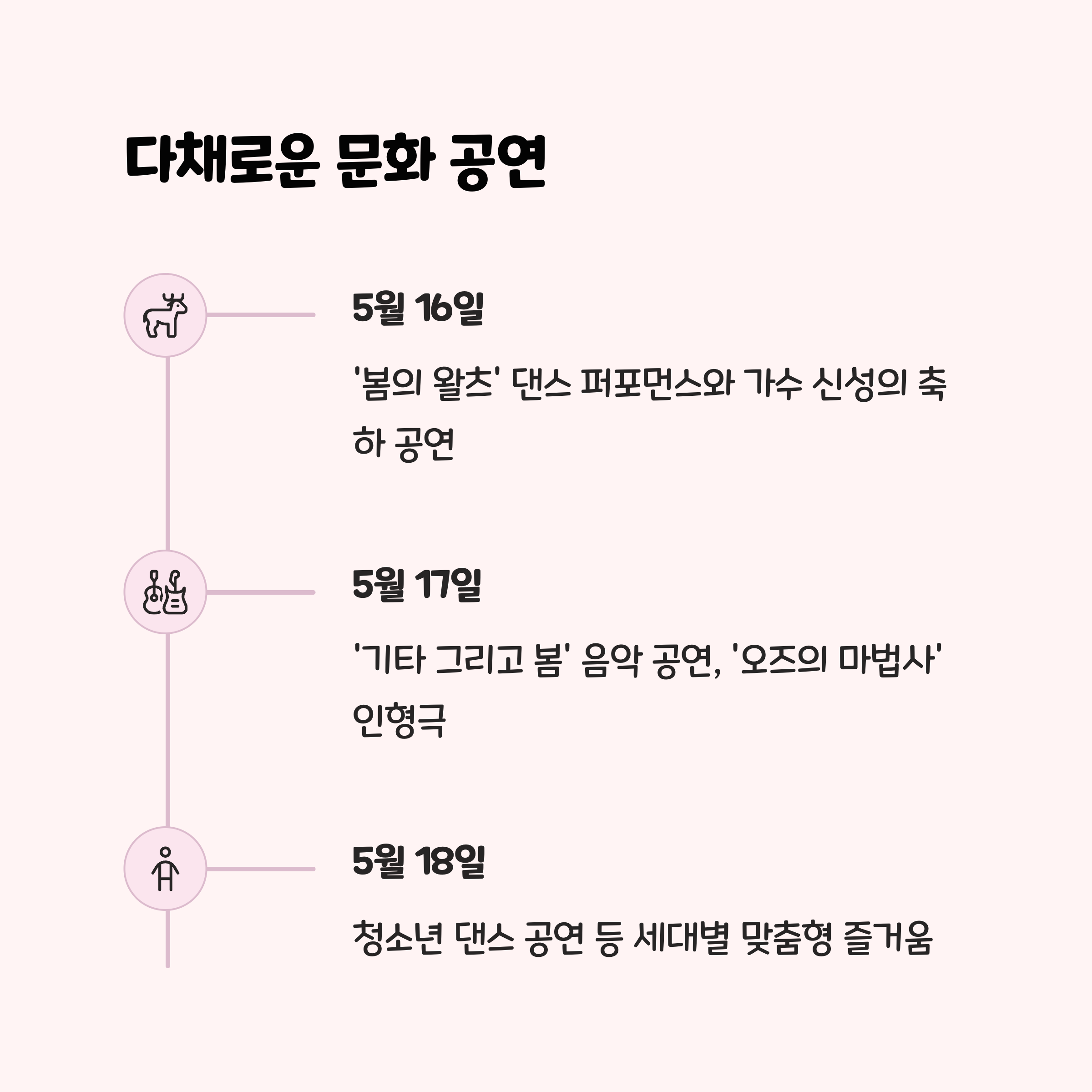 축제 기간 동안 다양한 문화 공연이 준비되어 있습니다. 5월 17일에는 7080세대를 위한 '기타 그리고 봄' 음악 공연과 '오즈의 마법사' 인형극, 어린이 마술쇼가 진행되며, 5월 18일에는 청소년 댄스 공연이 이어져 세대별 맞춤형 즐거움을 제공합니다.