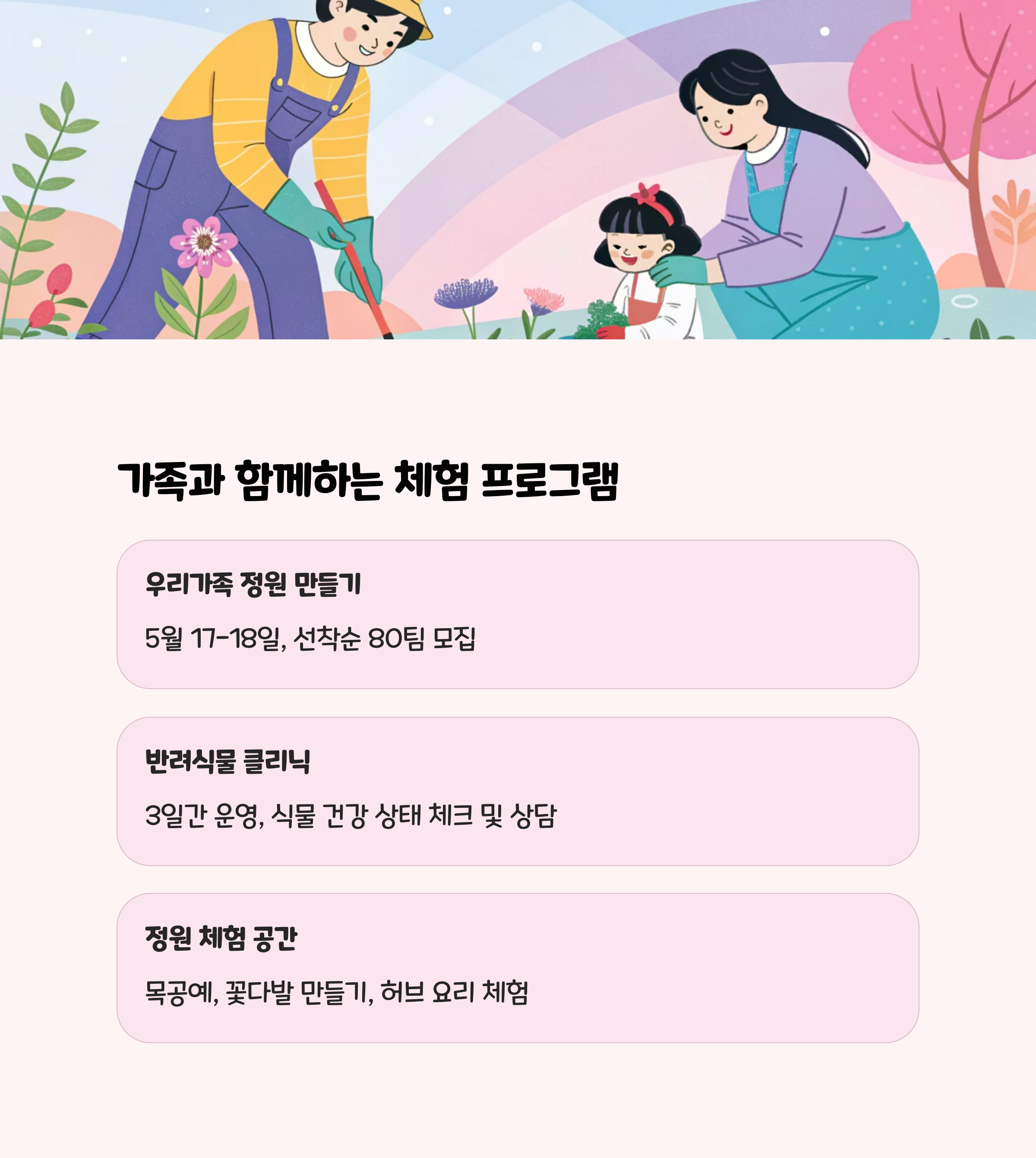가족 단위 방문객을 위한 ‘우리가족 정원 만들기’ 프로그램은 5월 17일과 18일, 각각 오전 10시와 오후 2시에 진행되며, 울산시청 홈페이지를 통해 선착순 80팀이 신청할 수 있습니다.