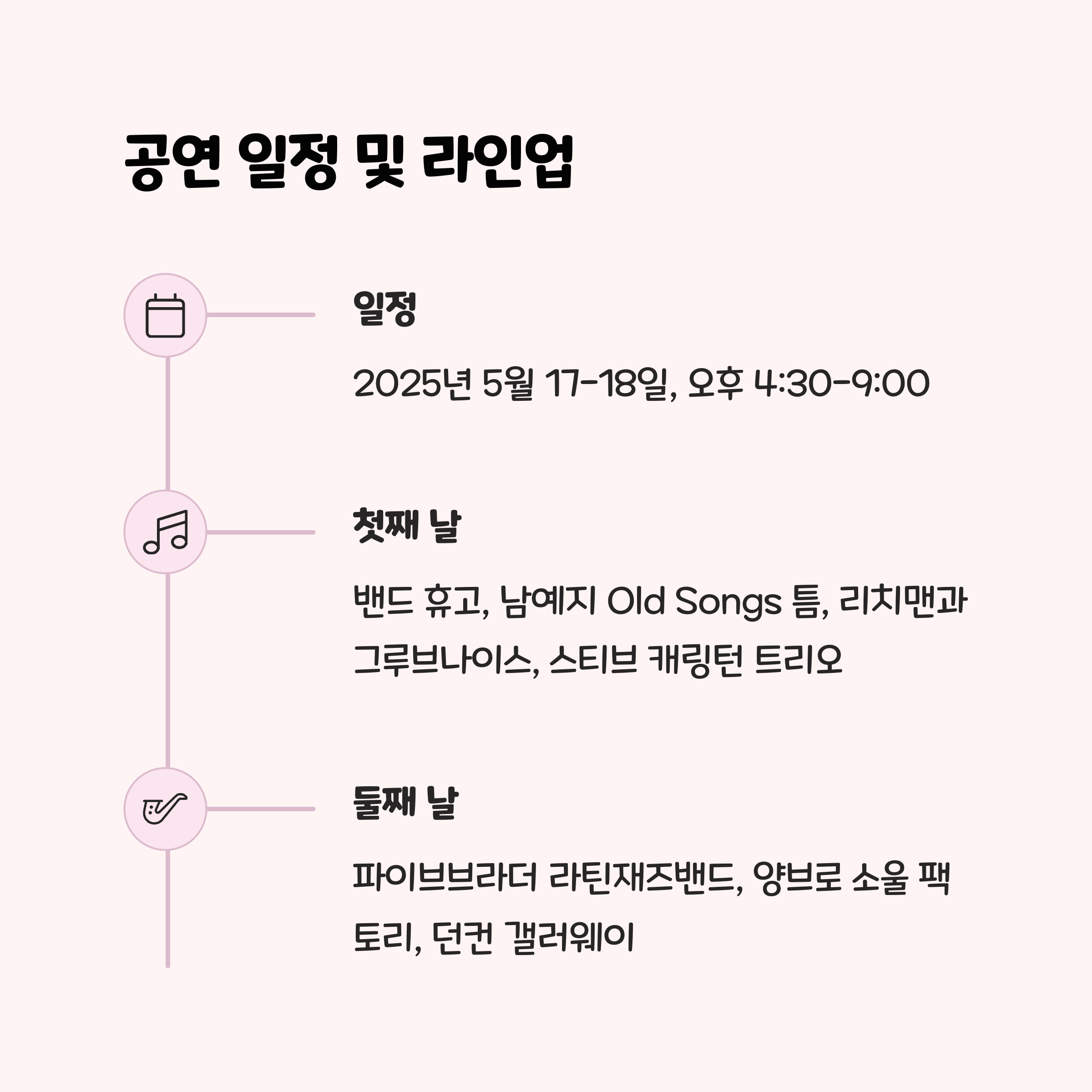 2025 태화강 국제 재즈 음악제는 5월 17일과 18일 양일간 태화강 국가정원 야외공연장에서 열립니다. 개막식은 17일 오후 6시 30분에 진행되며, 공연은 매일 오후 4시 30분부터 9시까지 이어집니다. 첫째 날에는 밴드 휴고, 남예지 Old Songs, 리치맨과 그루브나이스, 스티브 캐링턴 트리오 인피니티 등이 무대에 올라 대중적이면서도 감성적인 재즈 사운드를 선보입니다. 둘째 날에는 파이브브라더 라틴재즈밴드, 양브로 소울 팩토리, 해외 유명 뮤지션 던컨 갤러웨이가 공연을 펼쳐 라틴 리듬과 소울, 재즈의 다양한 매력을 선보일 예정입니다. 공연은 무료로 누구나 관람할 수 있으며, 전체관람가 등급으로 가족 단위 방문객도 안심하고 즐길 수 있습니다.
