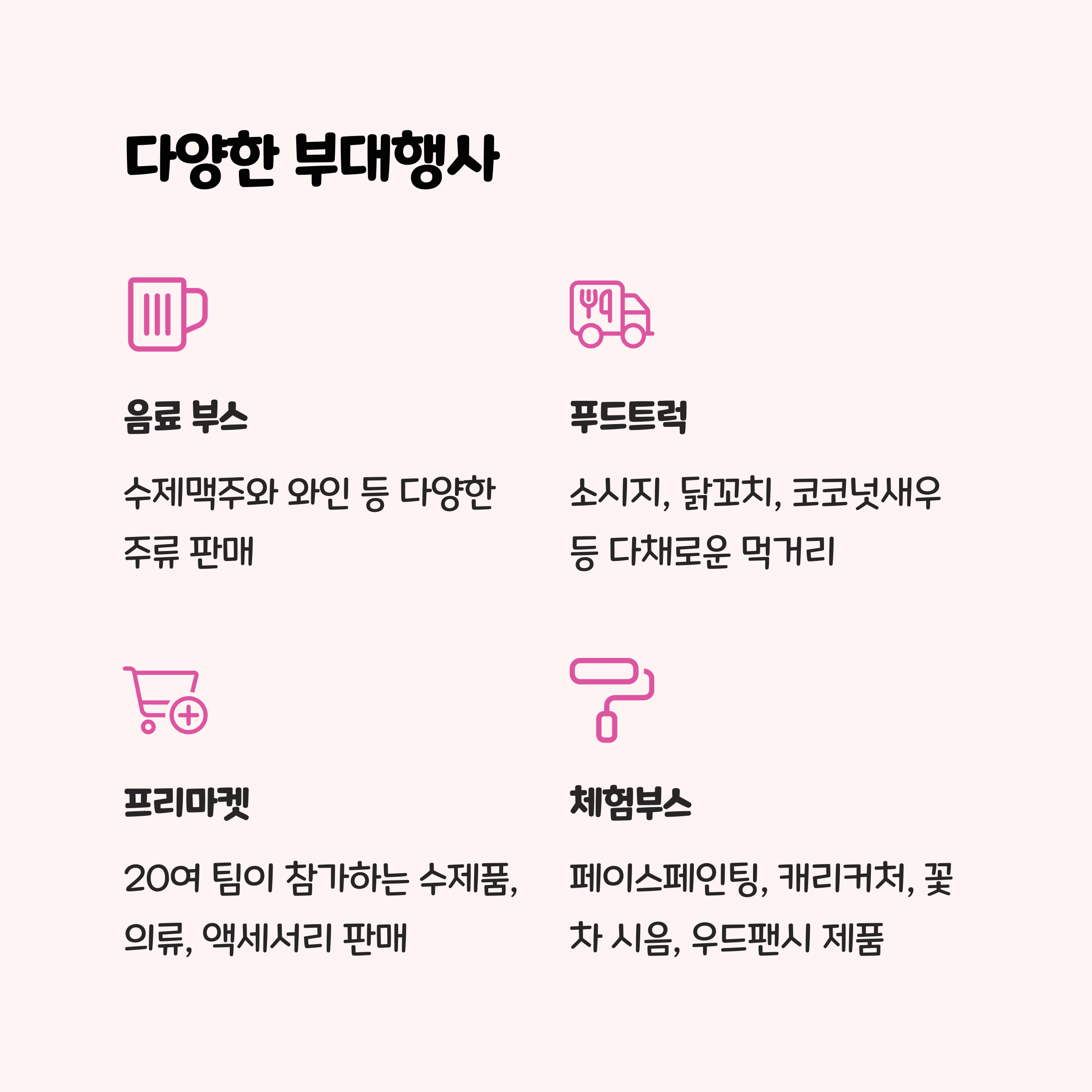메인 공연 외에도 다양한 부대행사와 편의시설이 마련되어 있어 방문객들에게 풍성한 즐길 거리를 제공합니다. 수제맥주와 와인 부스에서는 다양한 주류를 맛볼 수 있으며, 푸드트럭에서는 소시지, 닭꼬치, 코코넛새우 등 다채로운 먹거리를 즐길 수 있습니다. 프리마켓에서는 20여 팀이 참가해 수제품, 아동복, 신발, 스카프 등을 판매합니다. 체험부스에서는 페이스페인팅, 캐리커처, 꽃차 시음, 우드팬시 제품을 경험할 수 있습니다. 전면 경관 테이블, 무료 돗자리 대여, 캠핑의자 등 자율 관람 시스템이 구축되어 있어 누구나 편안하게 공연을 관람할 수 있는 환경이 마련됩니다.
