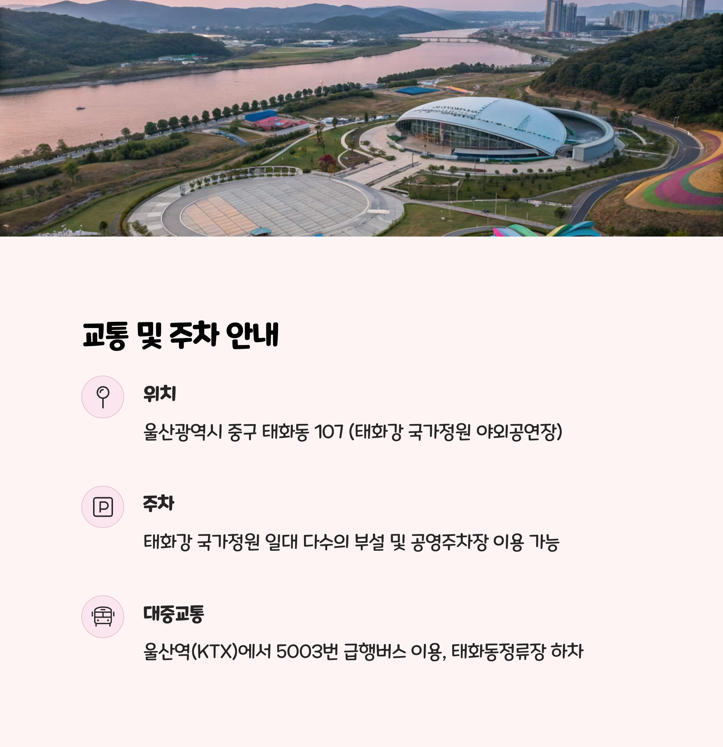 대중교통을 이용하는 경우 울산역(KTX)에서 5003번 급행버스를 타고 태화동정류장에서 하차하거나, 태화강역에서 도보로 이동할 수 있습니다. 대중교통 이용 시 혼잡을 피해 편리하게 행사장에 도착할 수 있습니다.