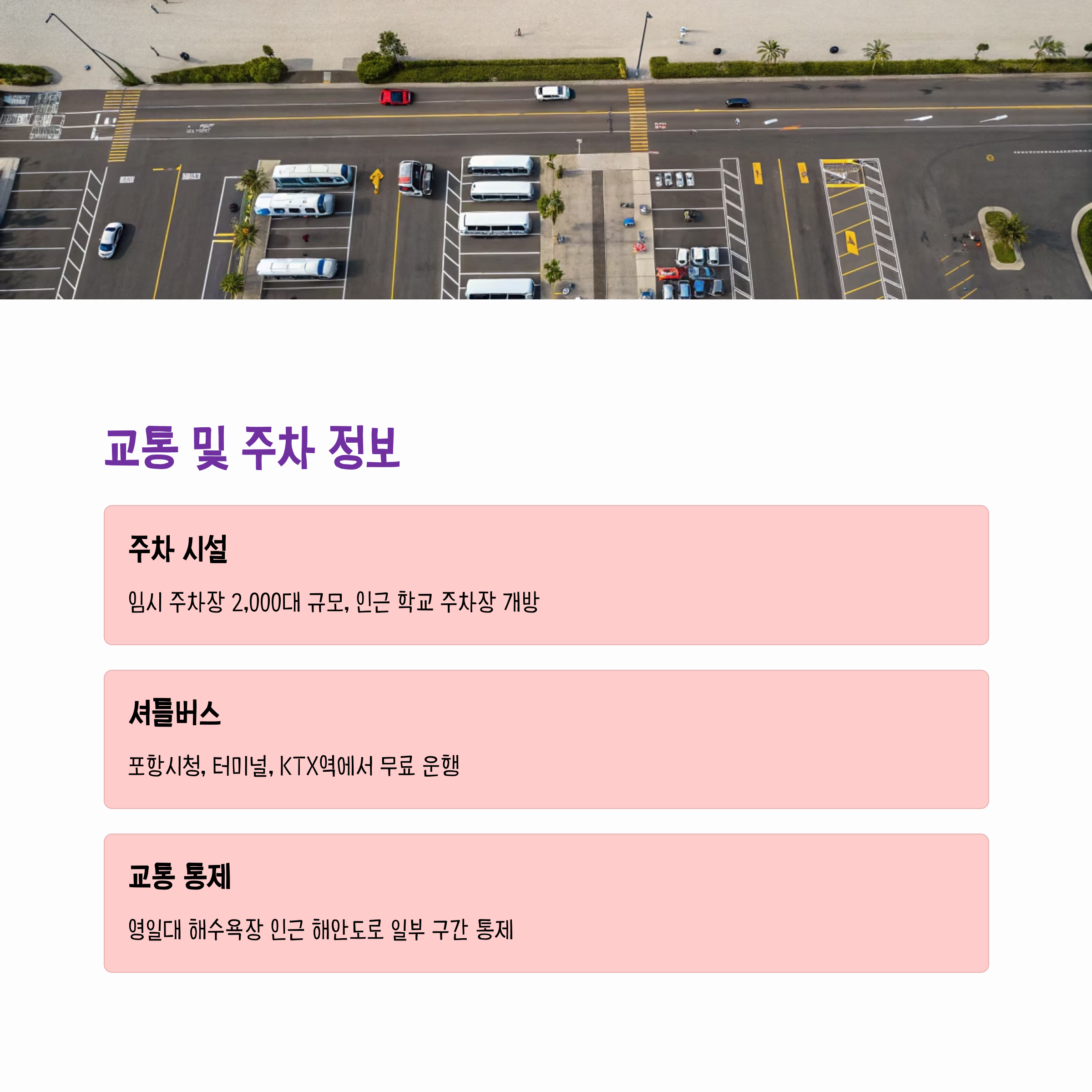 축제 당일 오후 1시부터 9시까지는 실시간 주차 정보를 제공할 예정입니다. 대중교통 이용객을 위한 무료 셔틀버스는 포항시청, 시외버스터미널, KTX 포항역 등 주요 지점에서 축제장까지 운행됩니다. 축제 기간 동안 시내버스도 증편 운행되며, 영일대 해수욕장 인근 해안도로 일부 구간은 교통 통제가 예정되어 있습니다. 혼잡을 피하기 위해 가급적 대중교통 이용을 권장합니다.
