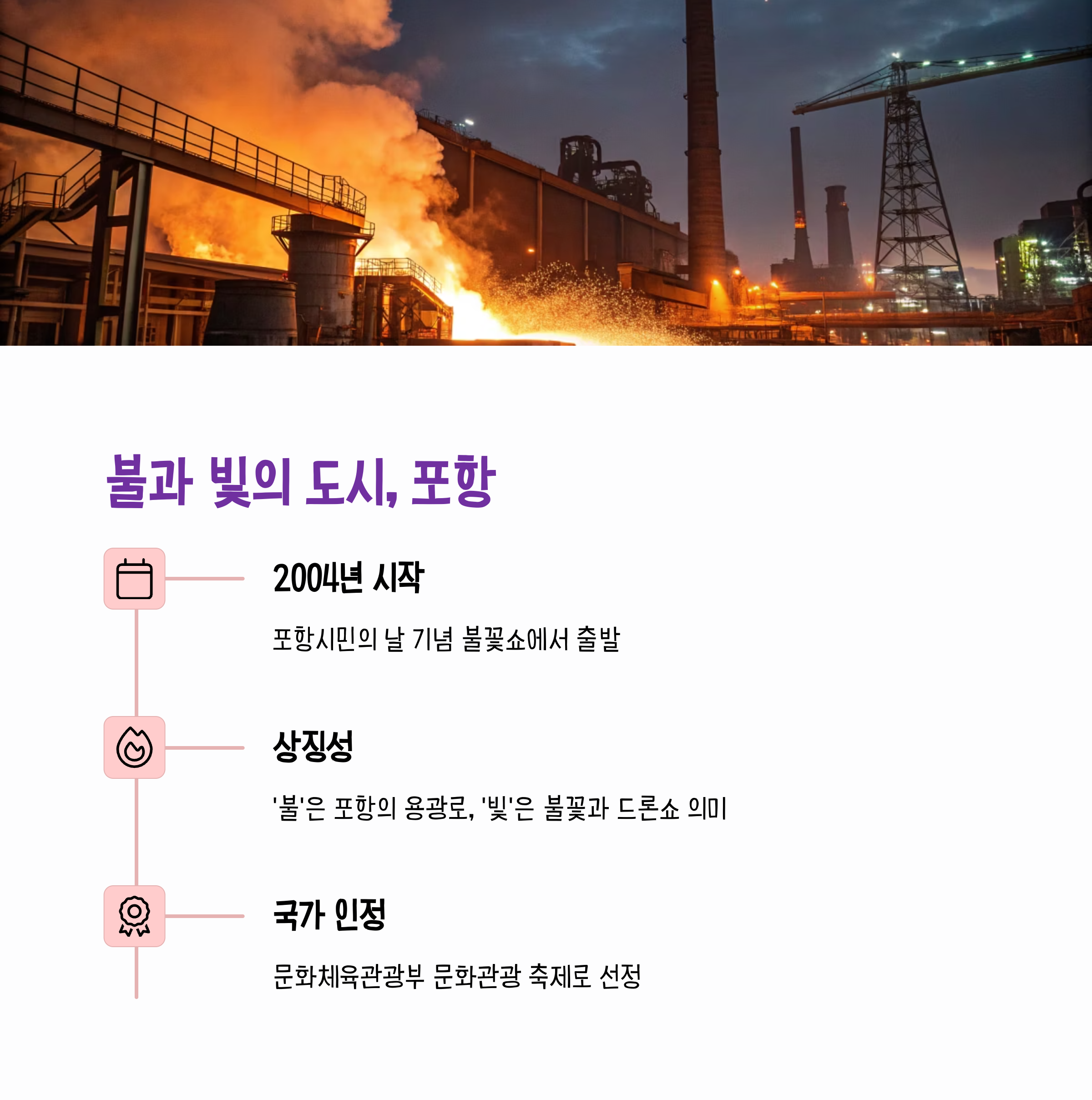 세계적인 철강 도시 포항의 이미지를 기반으로 '불과 빛의 도시'라는 콘셉트를 중심으로 매년 다양한 프로그램이 추가되고 발전했습니다. 문화체육관광부의 문화관광 축제로도 선정된 바 있으며, 산업과 문화가 결합된 독창적 축제로 국내외 관광객의 발길을 모으고 있습니다. 포항의 대표적인 여름축제로 자리 잡으며 지역 경제 활성화에도 큰 역할을 하고 있습니다.