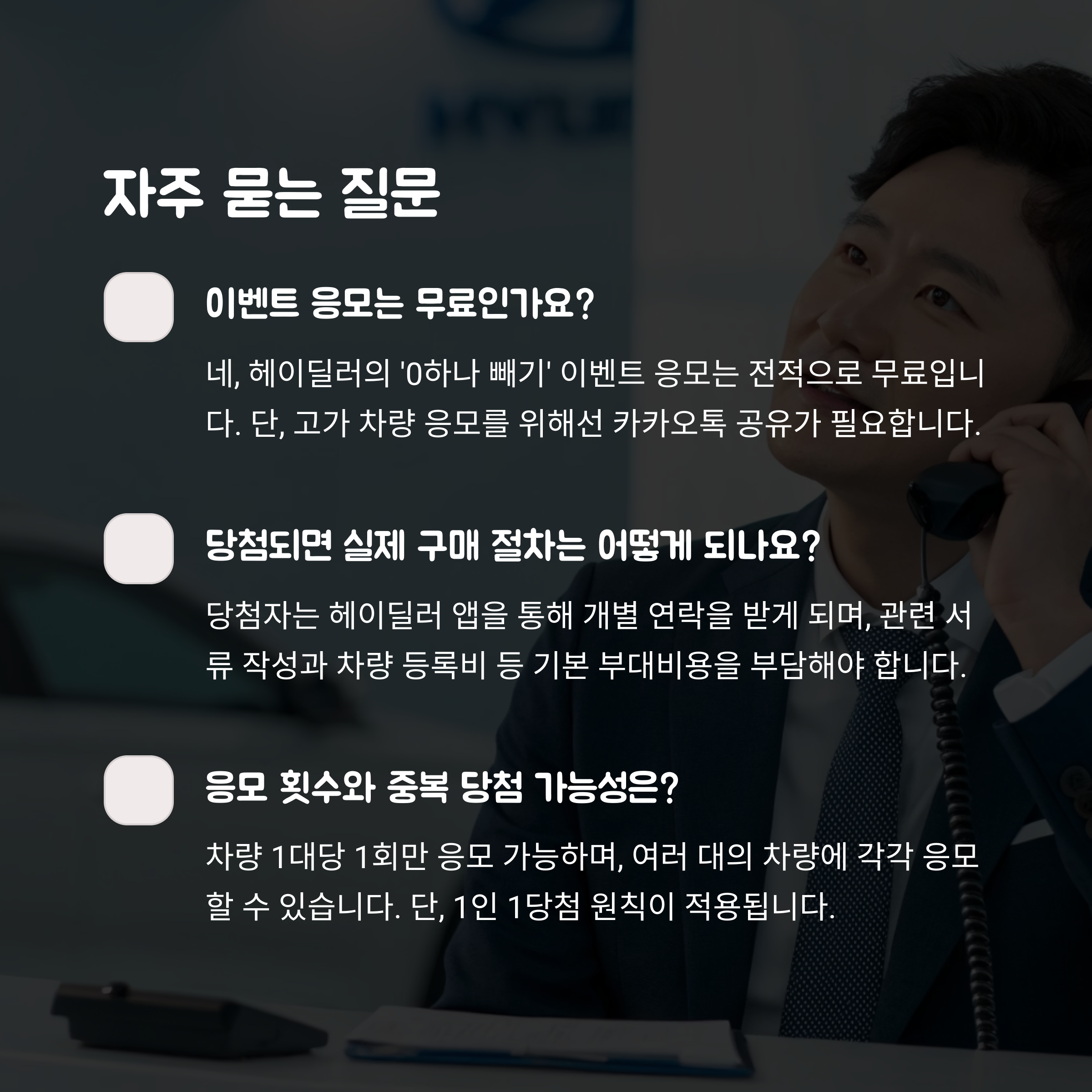 A. 네, 헤이딜러의 '0하나 빼기' 이벤트 응모는 전적으로 무료입니다. 단, 고가 차량 응모를 위해선 카카오톡 공유가 필요합니다.