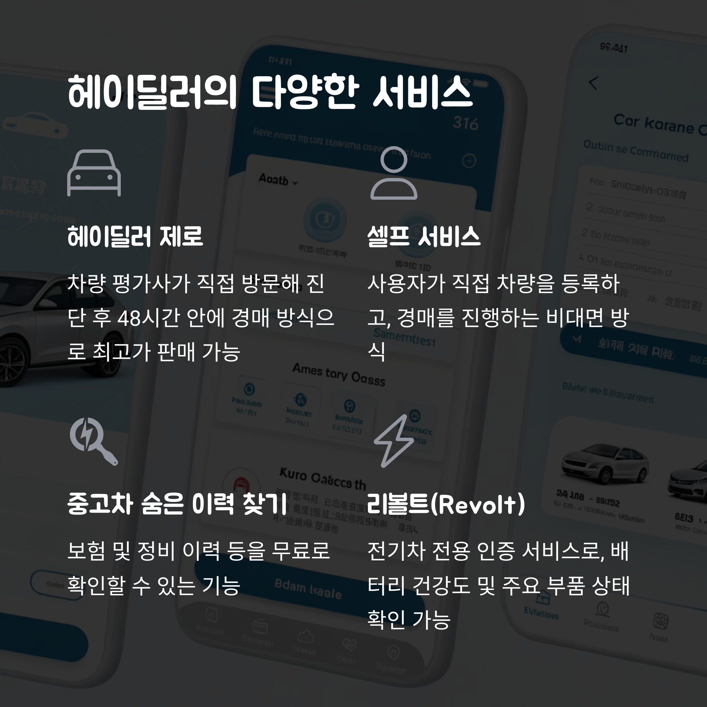 헤이딜러는 단순히 중고차를 판매하는 앱이 아닙니다. 사용자에게 다양한 방식의 차량 거래와 정보를 제공하는 플랫폼으로 진화하고 있습니다.