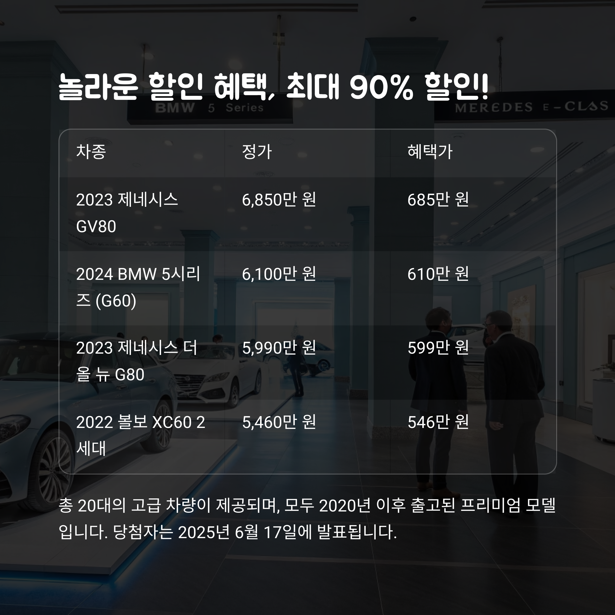 이름 그대로 차량 가격의 마지막 '0' 하나를 빼는 이 이벤트는, 프리미엄 자동차를 단 수백만 원대에 구매할 수 있는 기회를 제공합니다. 제네시스 GV80, BMW 5시리즈, 벤츠 E클래스 등 고급 차량 20대를 최대 90% 할인된 가격에 만날 수 있는 유일무이한 찬스, 본 글에서는 이벤트의 핵심 내용과 참여 방법, 주의사항을 모두 소개하겠습니다.