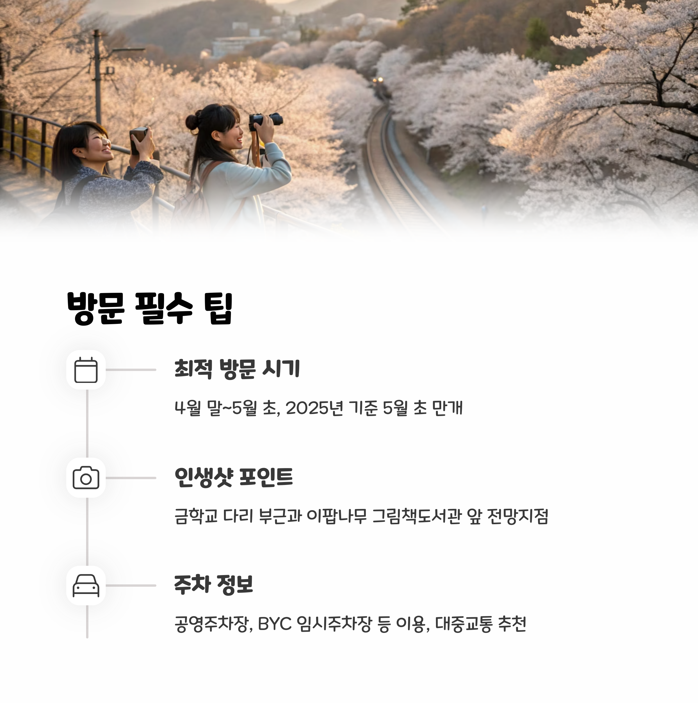더불어 철길 위를 덮고 있는 이팝나무들은 도시에서는 보기 어려운 자연의 모습과 함께 일상에 찌든 마음을 달래줄 수 있는 힐링 장소로 제격입니다. 복잡하고 빠르게 돌아가는 도심 속 삶에서 벗어나 이곳에서 잠시 머물러 봄의 향기와 자연의 소리를 느껴보는 것도 큰 위안이 됩니다.