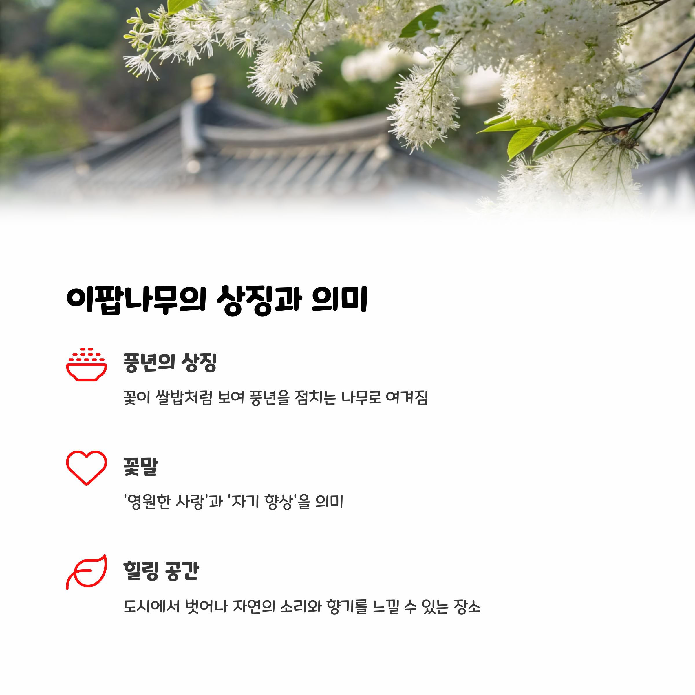 이팝나무는 꽃이 쌀밥처럼 보여 ‘풍년을 상징하는 나무’로 불립니다. 실제로 옛 조상들은 이팝나무가 얼마나 풍성하게 피느냐에 따라 벼농사의 풍년 여부를 점쳤다고 전해집니다. 이처럼 자연의 모습에서 삶의 방향을 읽어내려는 우리의 전통적 지혜는 지금까지도 많은 이들에게 감성을 자극하는 문화적 가치로 남아 있습니다.